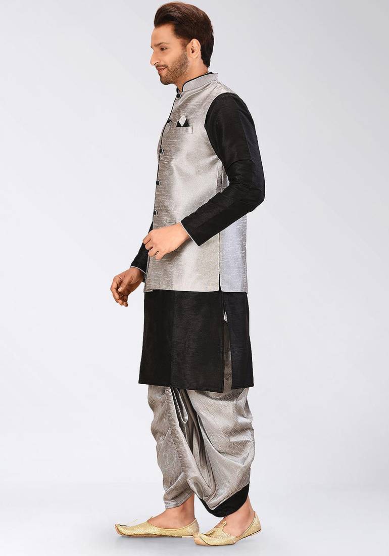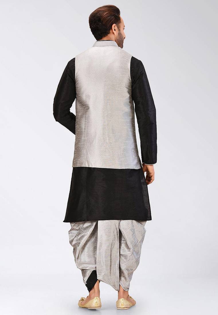 Black dupon art silk kurta, jacket with matching dhoti