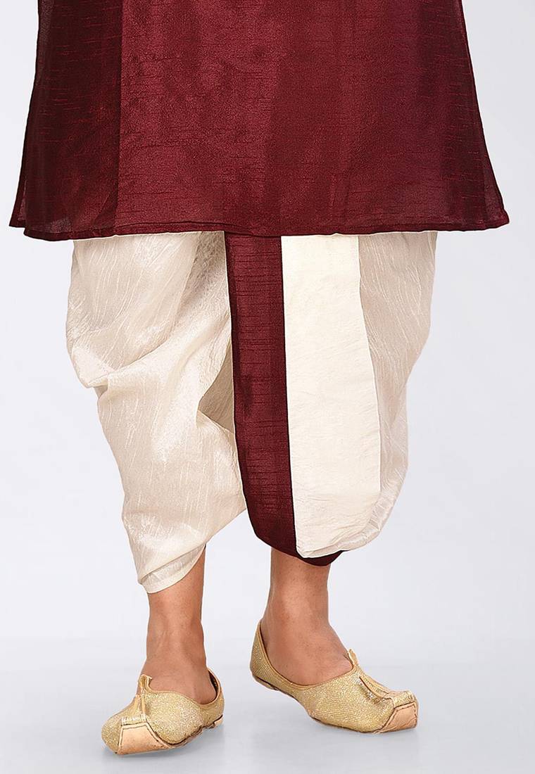 Maroon dupon art silk kurta, jacket with matching dhoti and churidar