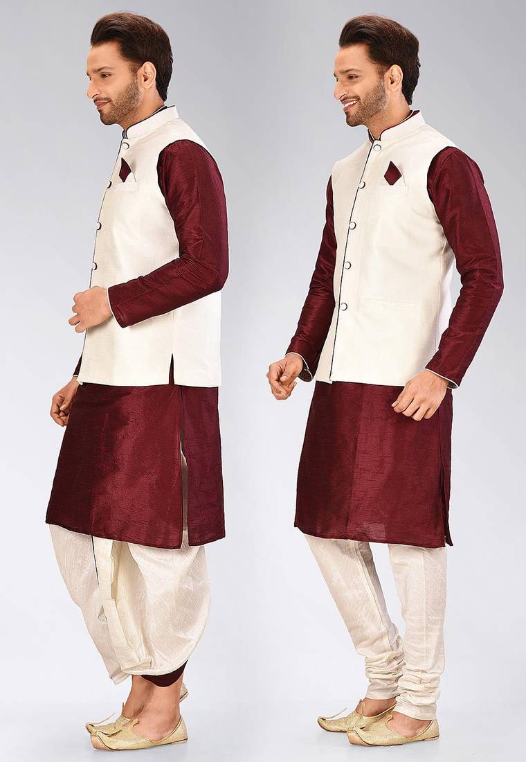| Product Name | Maroon Dupon Art Silk Kurta, Jacket With Matching Dhoti And Churidar | |
