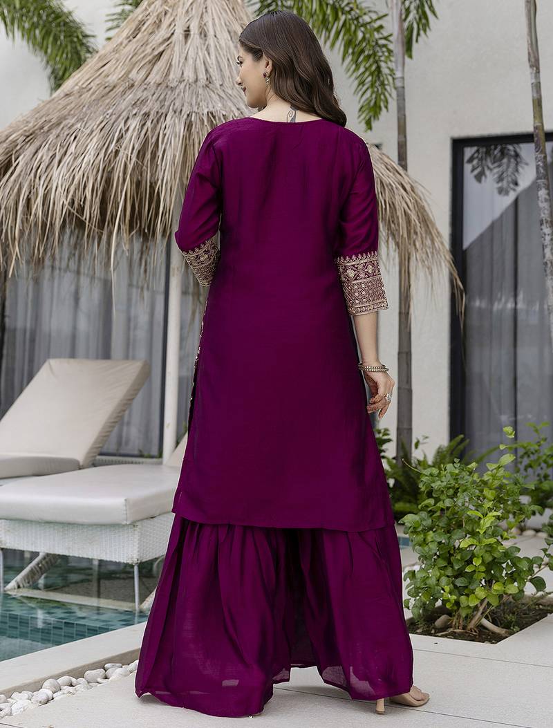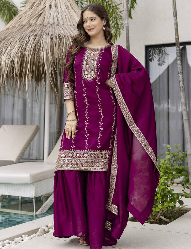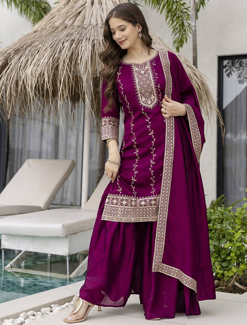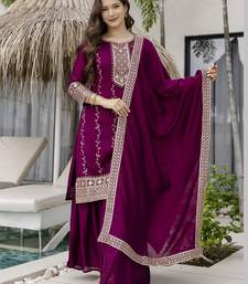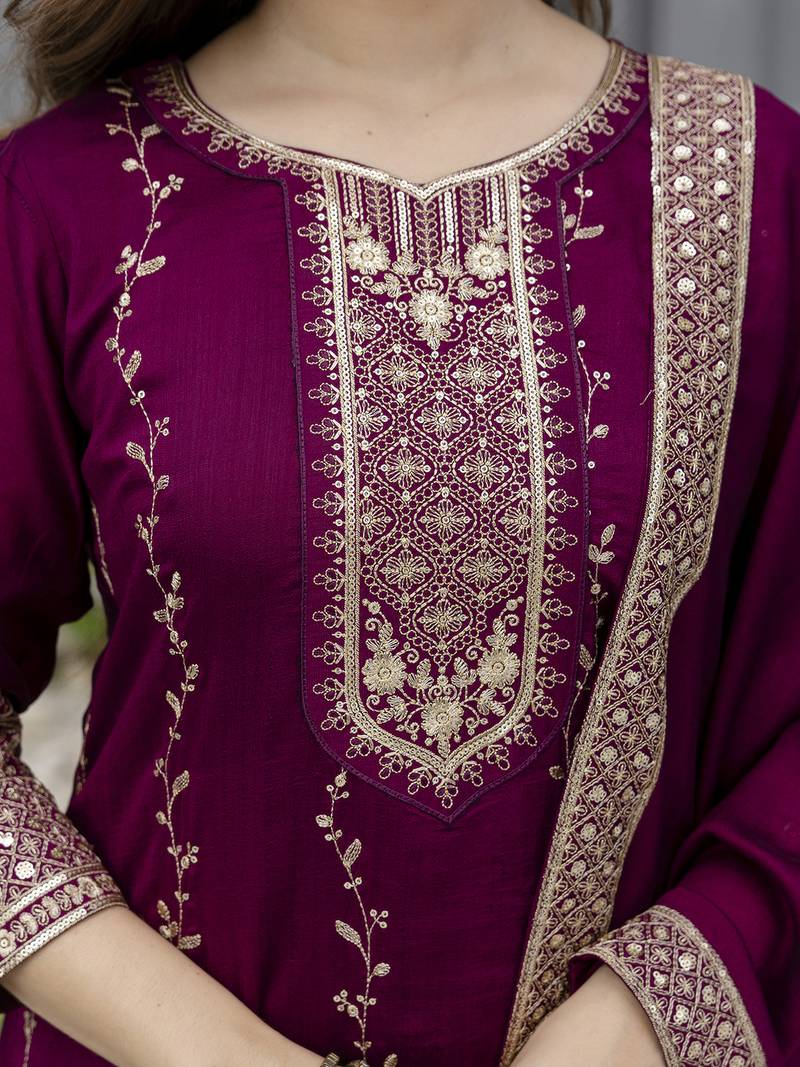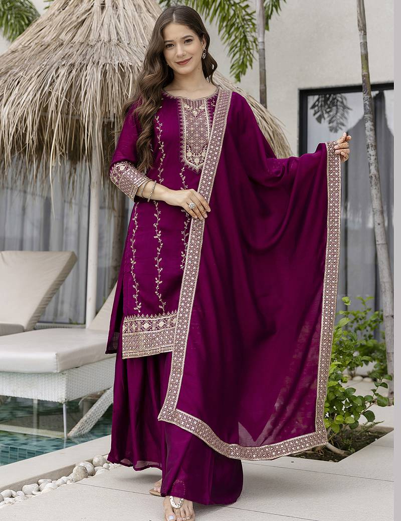 Beautiful embroidered vichitra silk fabric straight kurta, palazzo and dupatta set