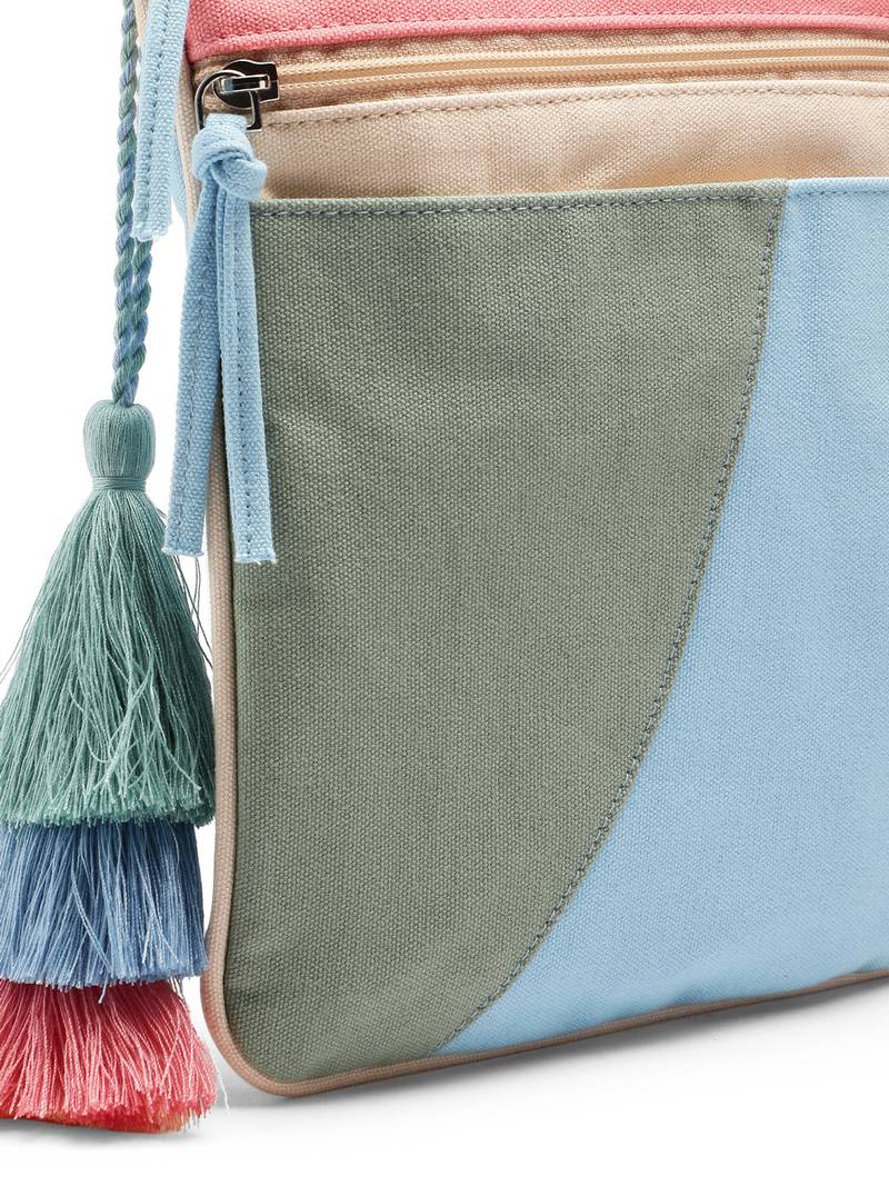 The Anekaant Pastel Multi Colourblocked Sling Bag From The Hue Collection Is A Vibrant And Functional Accessory Designed For Modern Women. Featuring A Mint Green Base With Aqua Blue, Coral, And Cream Colorblock Detailing, This Stylish Sling Bag Adds A Fresh Pop Of Color To Any Outfit. Crafted From Durable Cotton Canvas With A Soft Polycotton Lining, It Ensures Both Longevity And Comfort. The Colourblocked Design Is Enhanced With Playful Tassel Detailing, Giving The Bag A Youthful And Trendy Appeal. It Comes With One Main Compartment Secured By A Zipper Closure. Additional Features Include One External Slip Pocket At The Front With Velcro, Two External Zip Pockets, One At The Front And One At The Back And One Inner Zip Pocket To Keep Your Essentials Organized On The Go. Dimensions (L X H X W): 21 X 25 X 2 Cm.