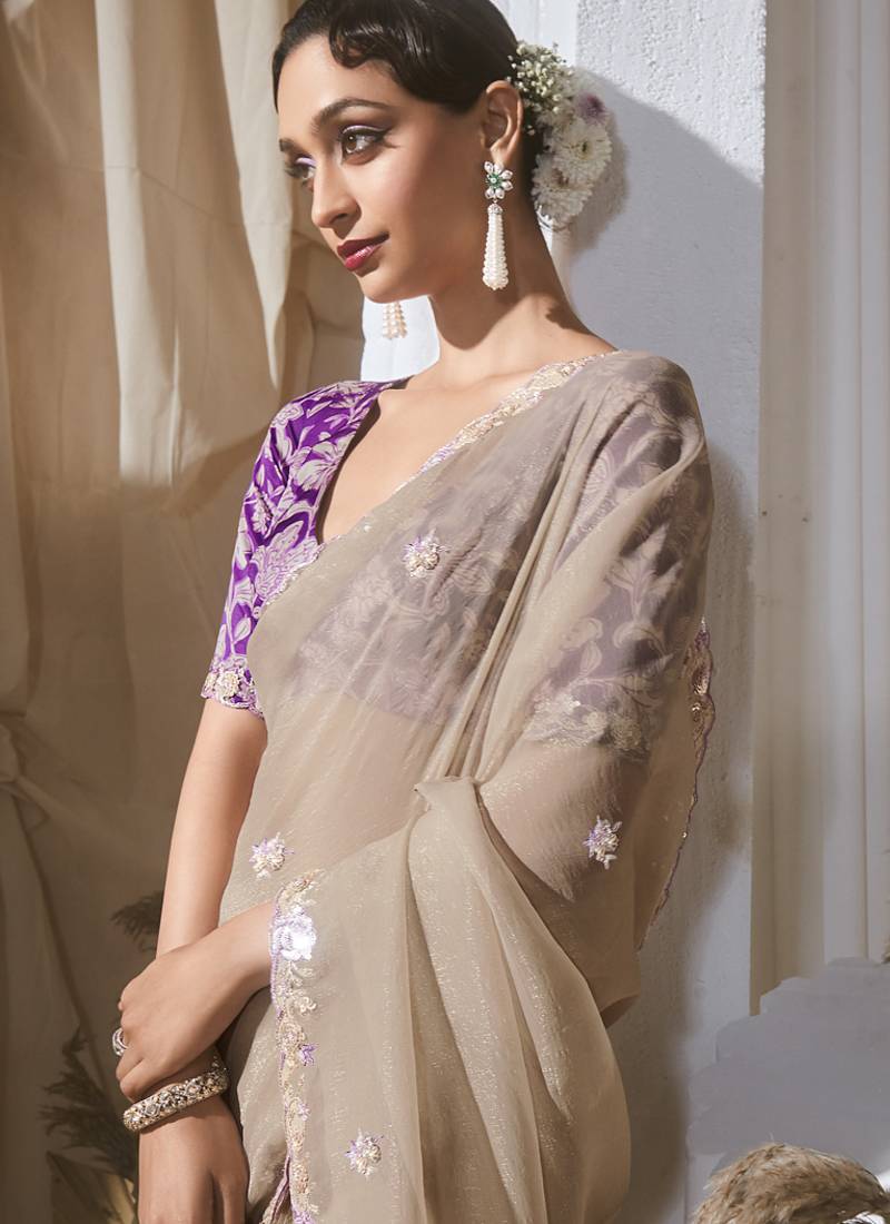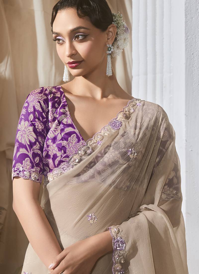 Beige tissue silk blend sequince work designer border with digital printed blouse party wear saree
