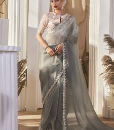Gray tissue silk blend sequince work designer border with tussel on pallu & digital printed blouse party wear saree