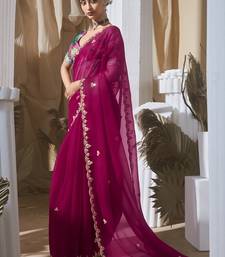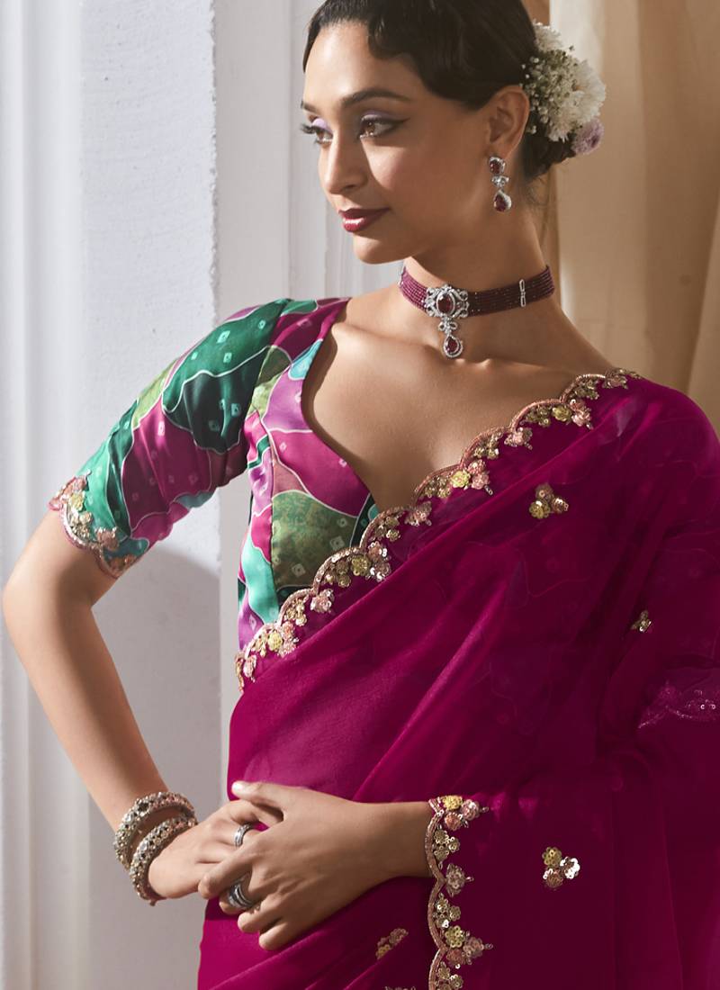 Rani pink tissue silk blend sequince work designer border with digital printed blouse party wear saree