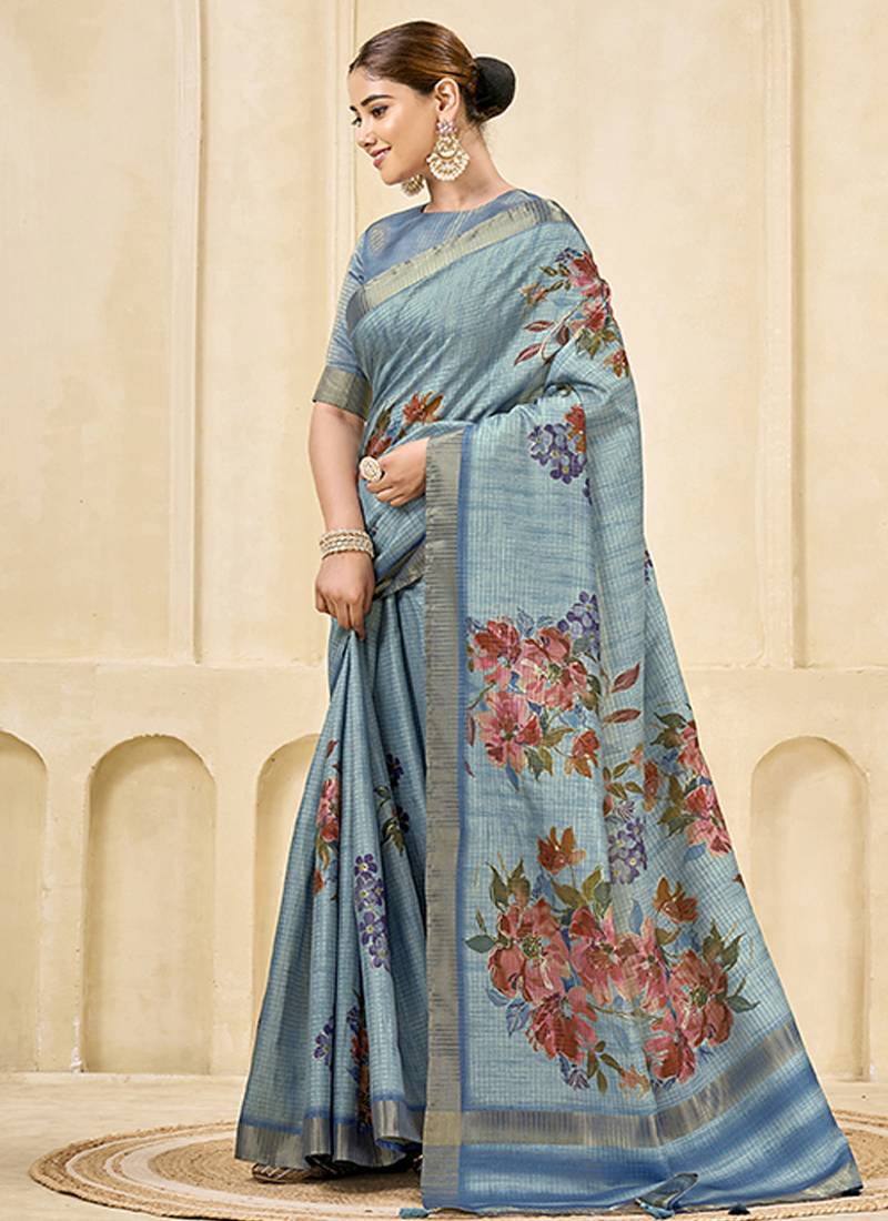 Sky blue pink signora zari silk blend floral digital printed casual wear saree.
