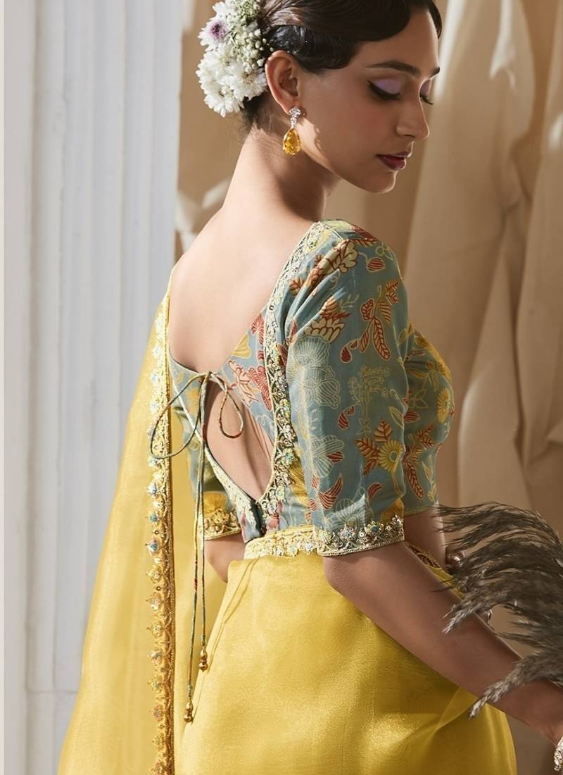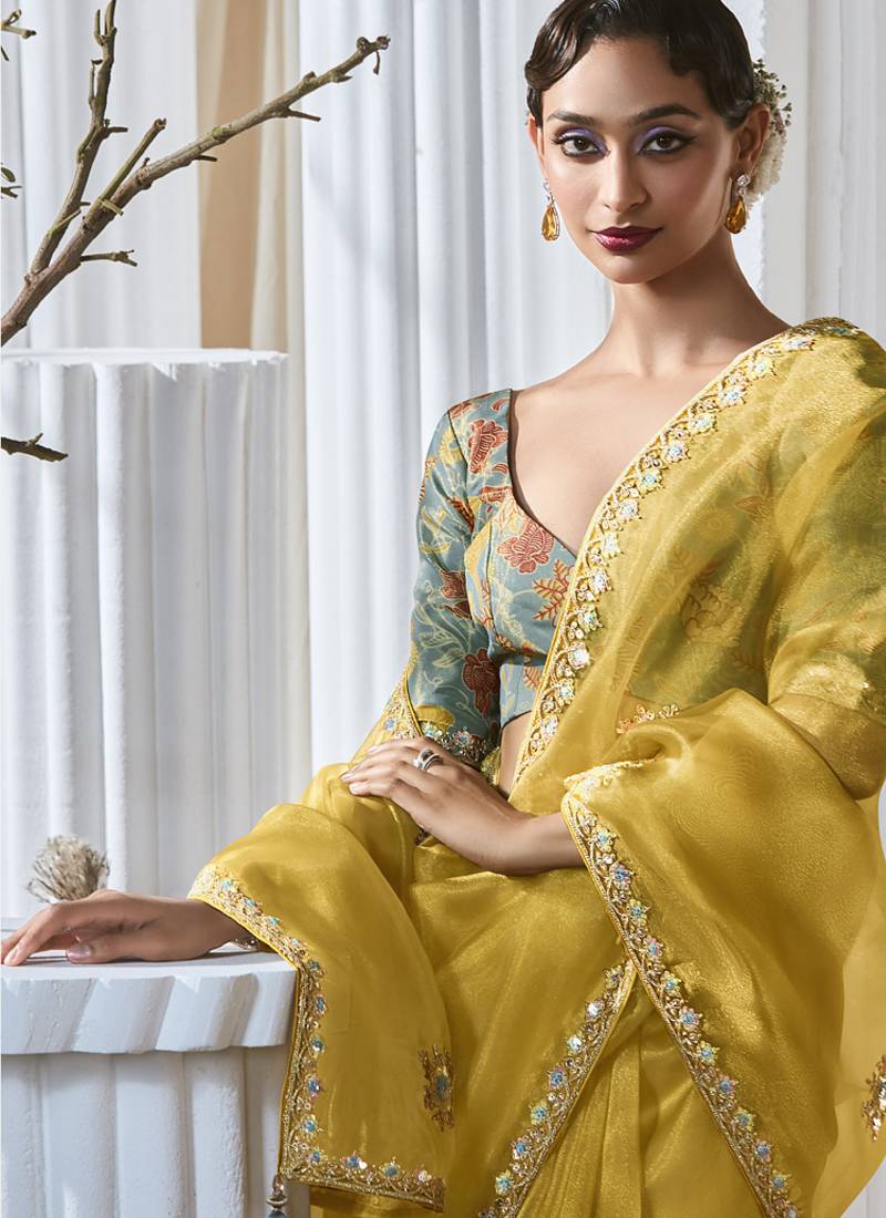 | Product Name | Yellow Tissue Silk Blend Sequince Work Designer Border With Digital Printed Blouse Party Wear Saree | |