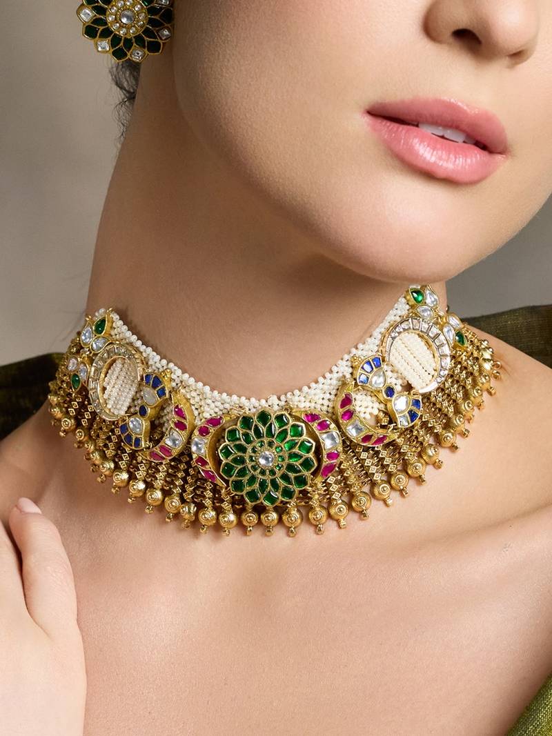 | Product Description | Embrace Elegance With This Golden Beaded Necklace And Earring Set, Adorned With Vibrant Green, Red, And White Beads In Intricate Patterns. A Celebration Of Craftsmanship And Tradition, It Radiates Festive Brilliance And Adds Regal Charm To Every Ensemble. Add Matching Earrings & Accessories To Complete The Look.