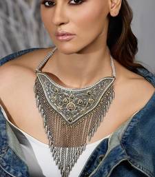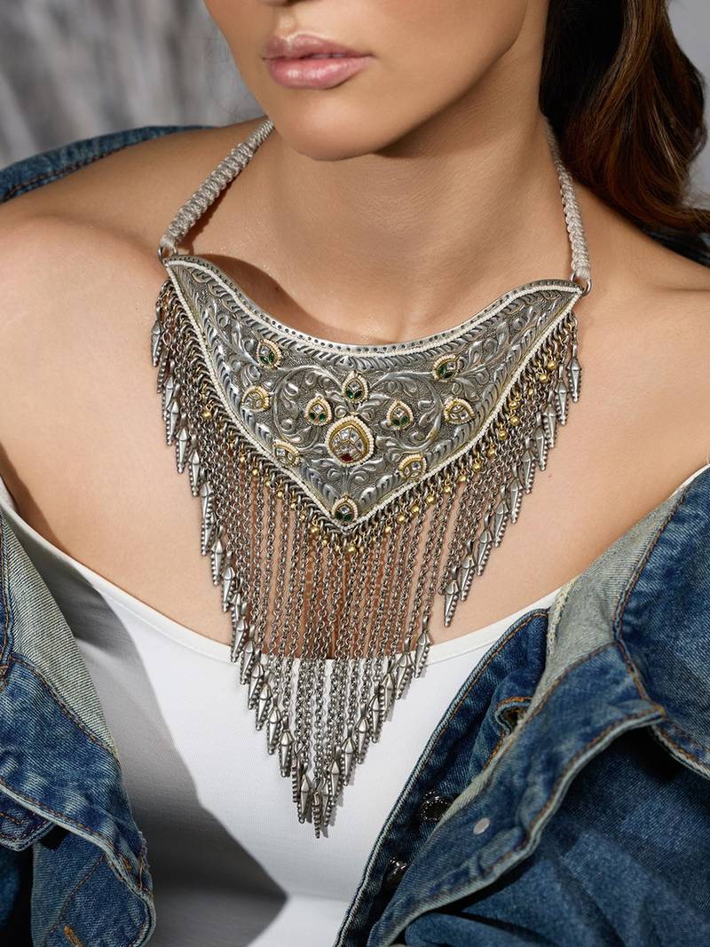 | Product Description | This Shadow Grace Oxidized Choker Necklace Features Intricate Detailing, Dangling Metallic Chains, And A Vintage, Tribal Inspired Appeal. Accented With Hints Of Green And Gold, It's A Bold Statement Piece Perfect For Fusion Wear, Festive Looks, Or Cultural Events.