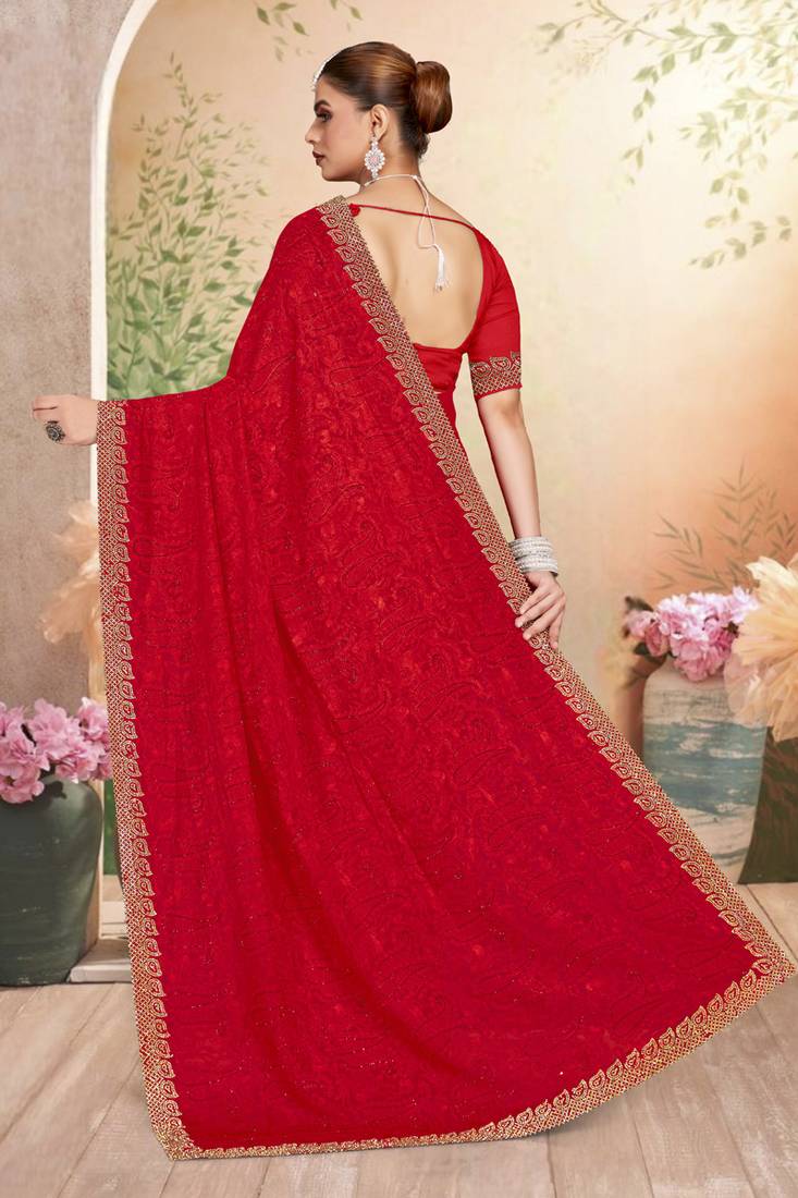 | Product Name | Designer Red Resham Embroidery Zarkan Border Georgette Saree | |