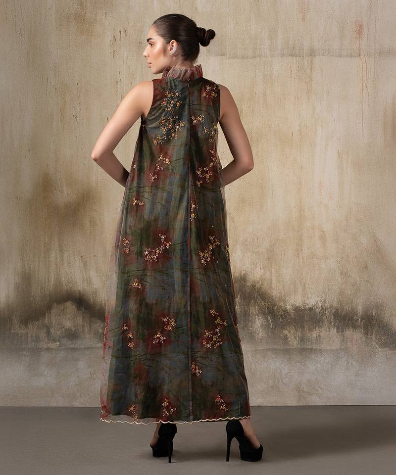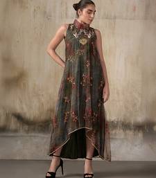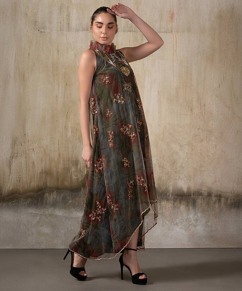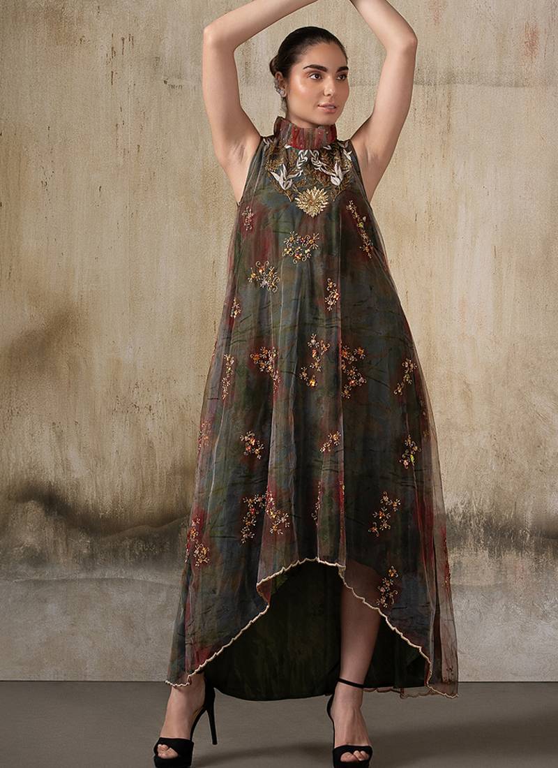 | Product Description | This Olive Green Asymmetrical Dress Is Crafted In Sheer Fabric With A Soft Flowy Fall. It Features Delicate Floral Sequin Embroidery In Gold And Rust Tones, Adding Sparkle To Its Earthy Base. The High Ruffled Neckline And Sleeveless Cut Bring A Refined Charm, While The Layered Hemline Enhances Movement And Elegance.