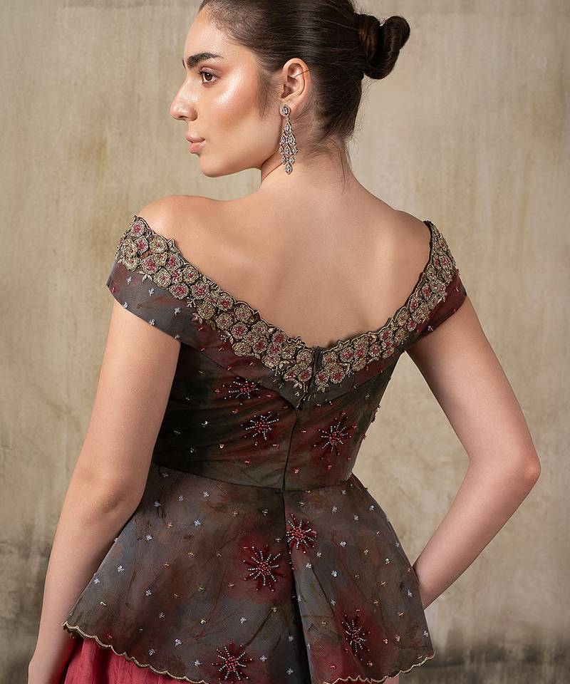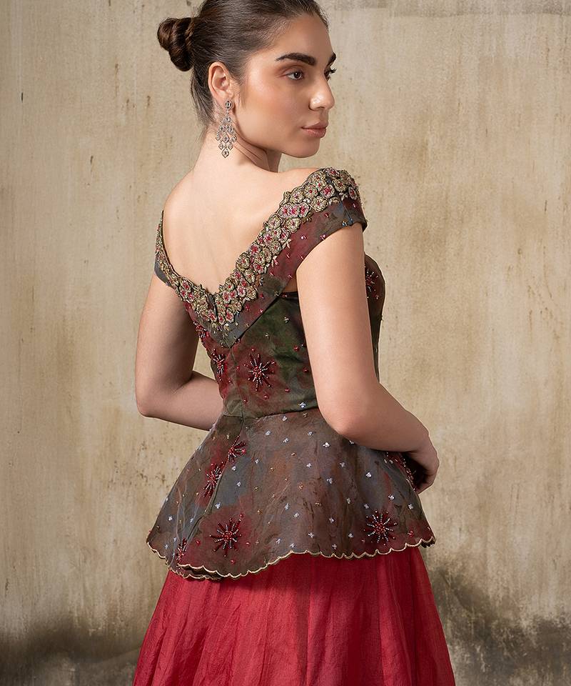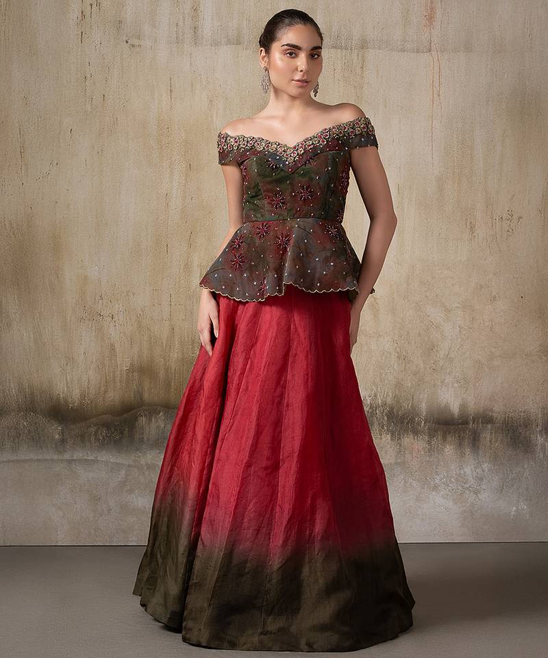 | Product Description | This Striking Ombré Gown Features A Flared Skirt Shaded In Rich Tones Of Red And Olive Green For A Dramatic Effect. The Off Shoulder Peplum Blouse Is Adorned With Delicate Floral Embroidery, Beadwork, And Scattered Sequins For A Touch Of Sparkle. The Scalloped Hem Of The Blouse Adds A Feminine Detail While The Fitted Bodice Enhances The Silhouette