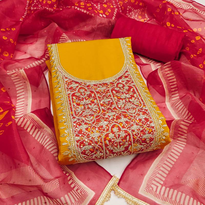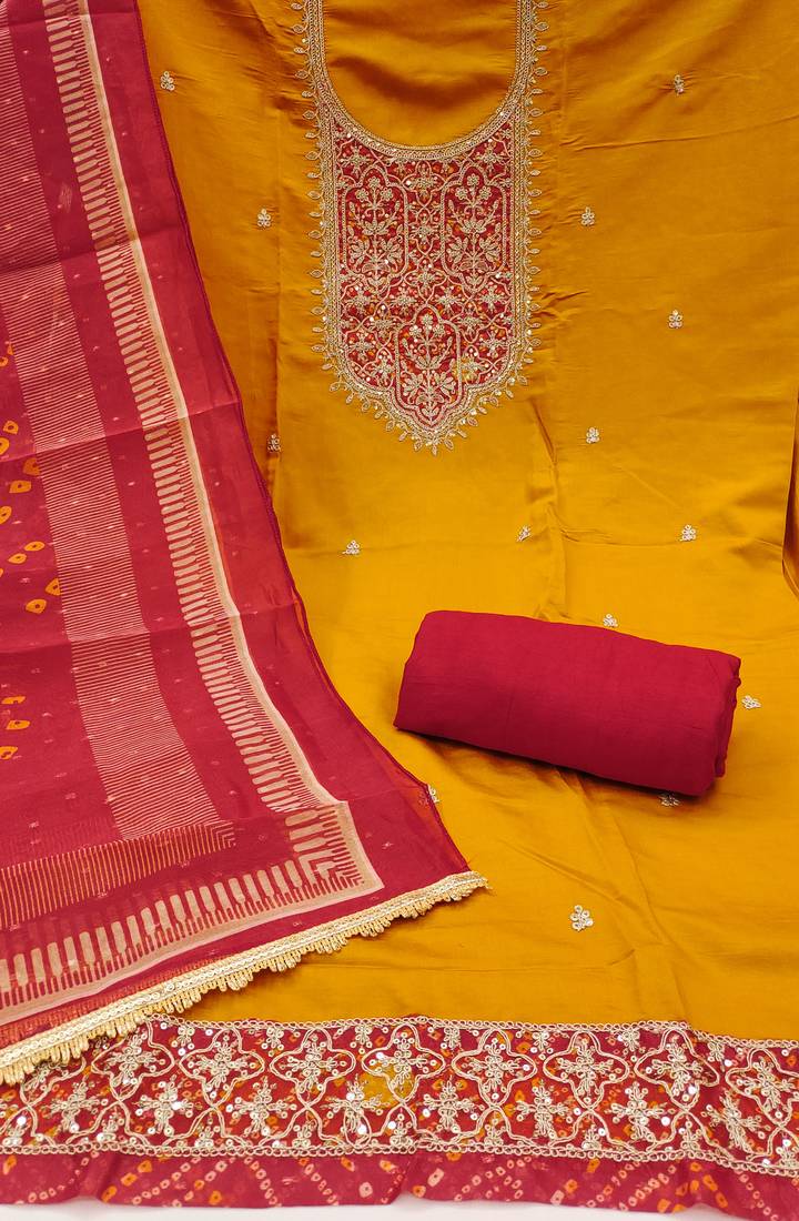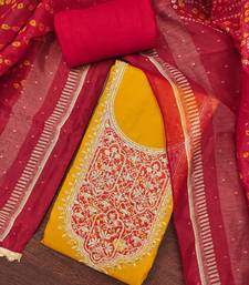 Yellow premium roman cotton embroidered unstitched dress material