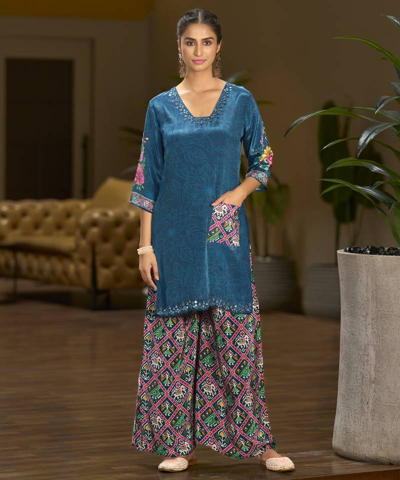 | Product Description | Chic Teal Blue Pure Crepe Co Ord Set Featuring A Floral Printed Straight Tunic With Soft Cotton Lining, Adorned With Mirror, Bead, Embellishment, And Intricate Kantha Work. Paired With A Printed Fully Elasticated Full Length Palazzo, It Ensures Comfort With Style. Perfect For Festive Occasions, Parties, And Celebrations, This Elegant Ensemble Blends Traditional Craftsmanship With Modern Sophistication. | |