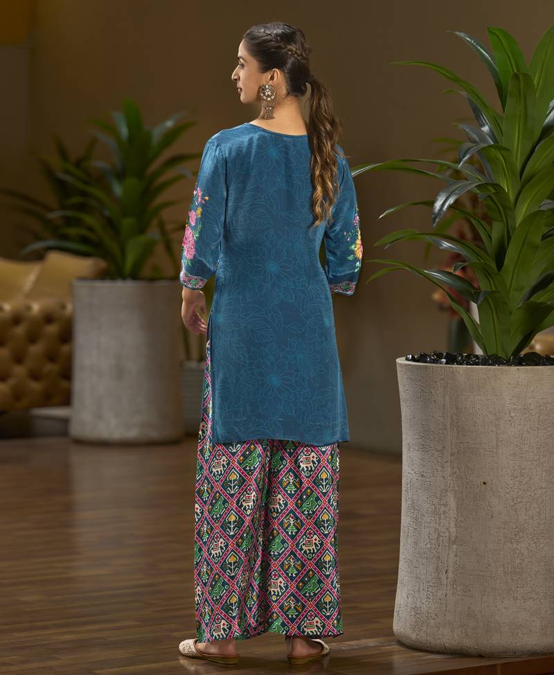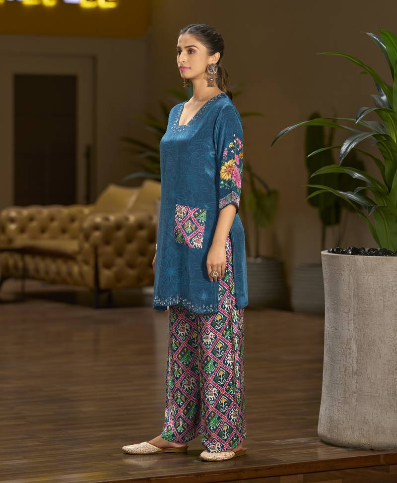 | Product Name | Teal Blue Pure Crepe Floral Printed Embellished Festive & Party Co Ord Set | |