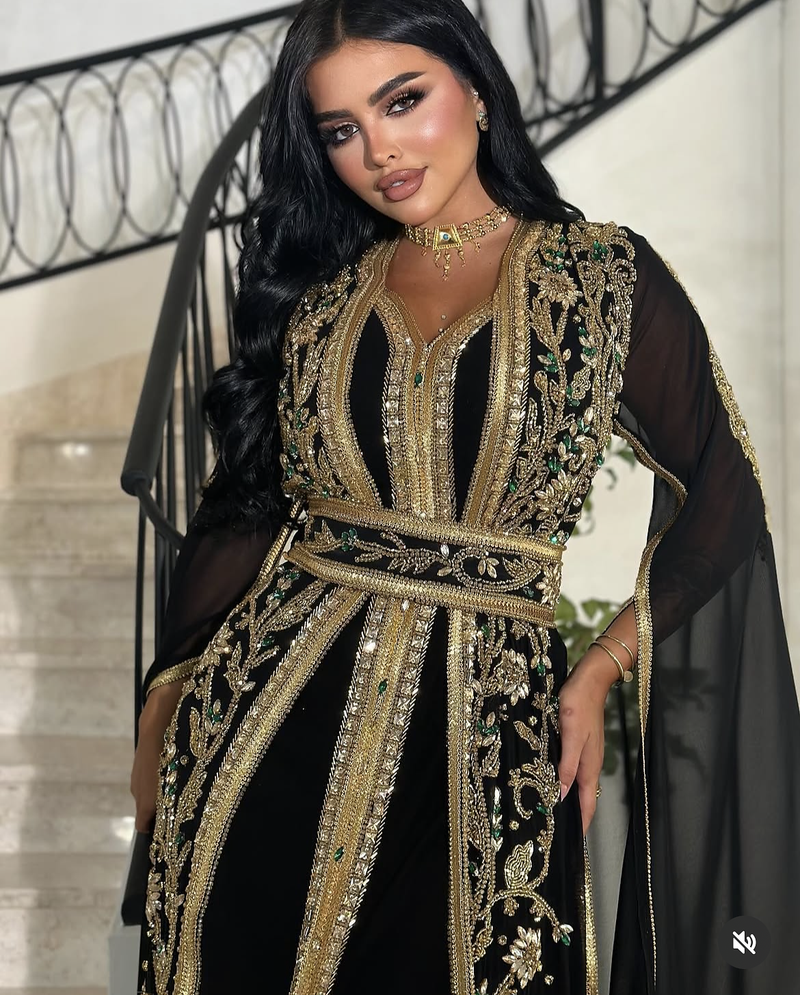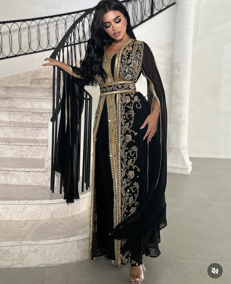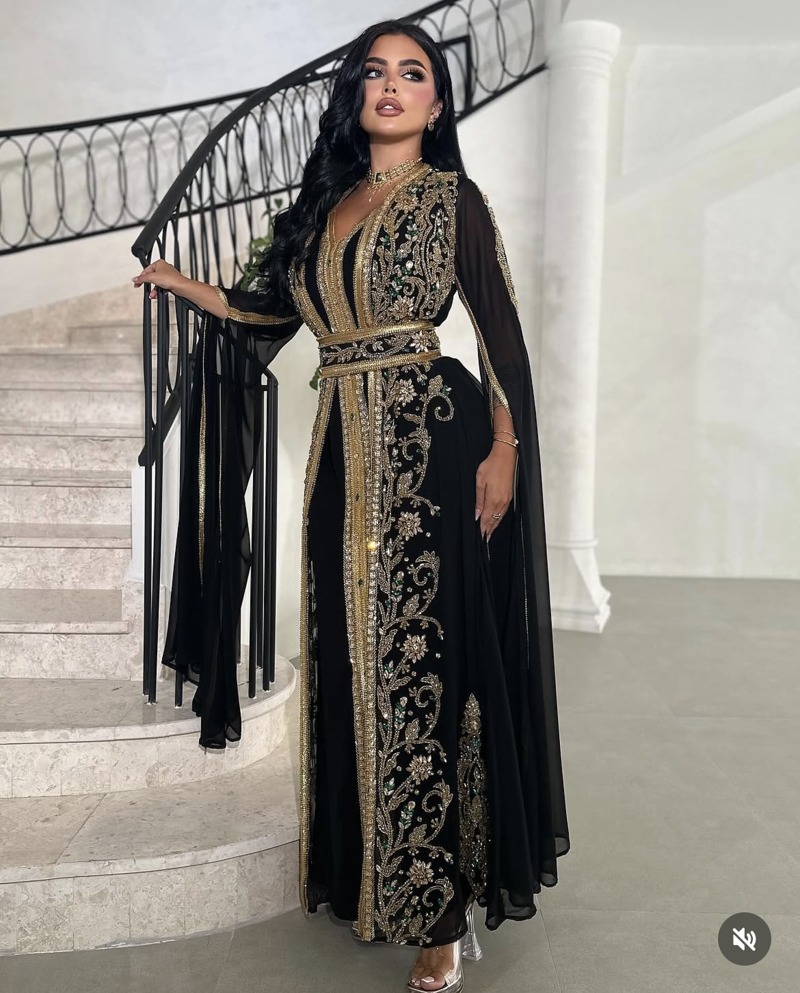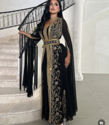 | Product Name | Black Moroccan Stitched Kaftan With Golden Hand Embroidery & Sheer Cape Sleeves Premium Designer Dress | |