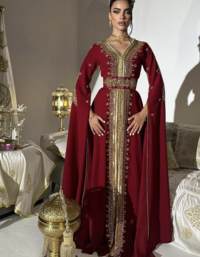 | Product Name | Royal Maroon Embroidered Moroccan Stitched Kaftan With Golden Handwork & Cape Sleeves | |