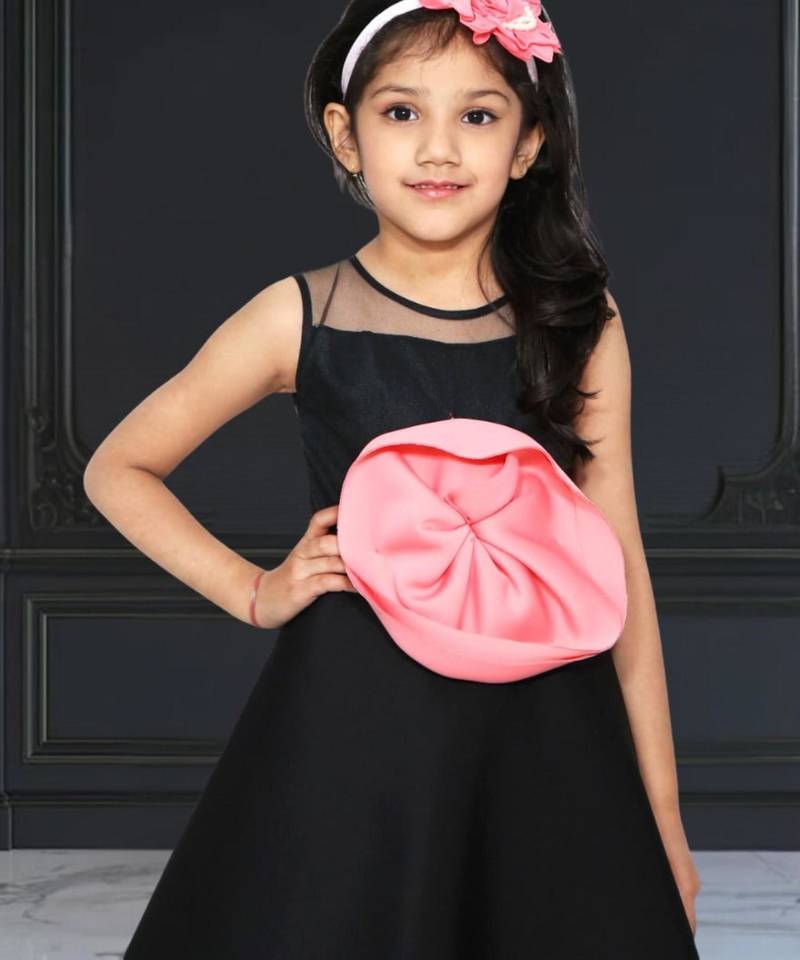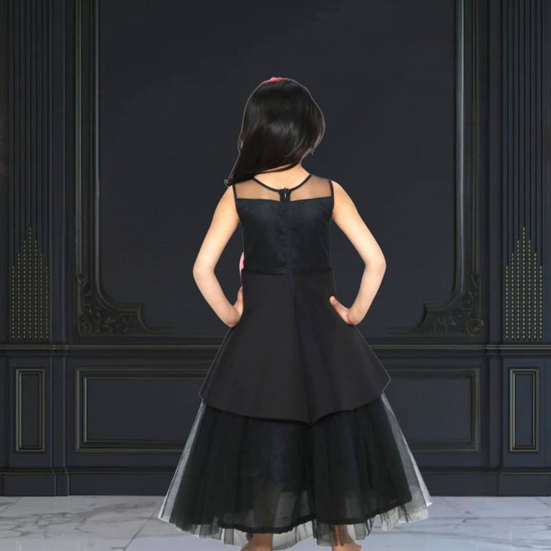 | Product Description | Buy Princess Floor Length Flower Girl Dress In Enchanting Black Color. Sleeveless Bodice With Mesh Neckline Comes With Layers Of Flares Making It A Perfect Children Fashion Designer Birthday Dress For Girls. Delightful Kids’ Designer Clothing Designed Using Lycra And Net Fabric With A Big Pink Flower On The Waist. A Unique Girls Couture Dress To Shop Online And Dress Your Princess In Style For Weddings And Formal Gatherings. | |