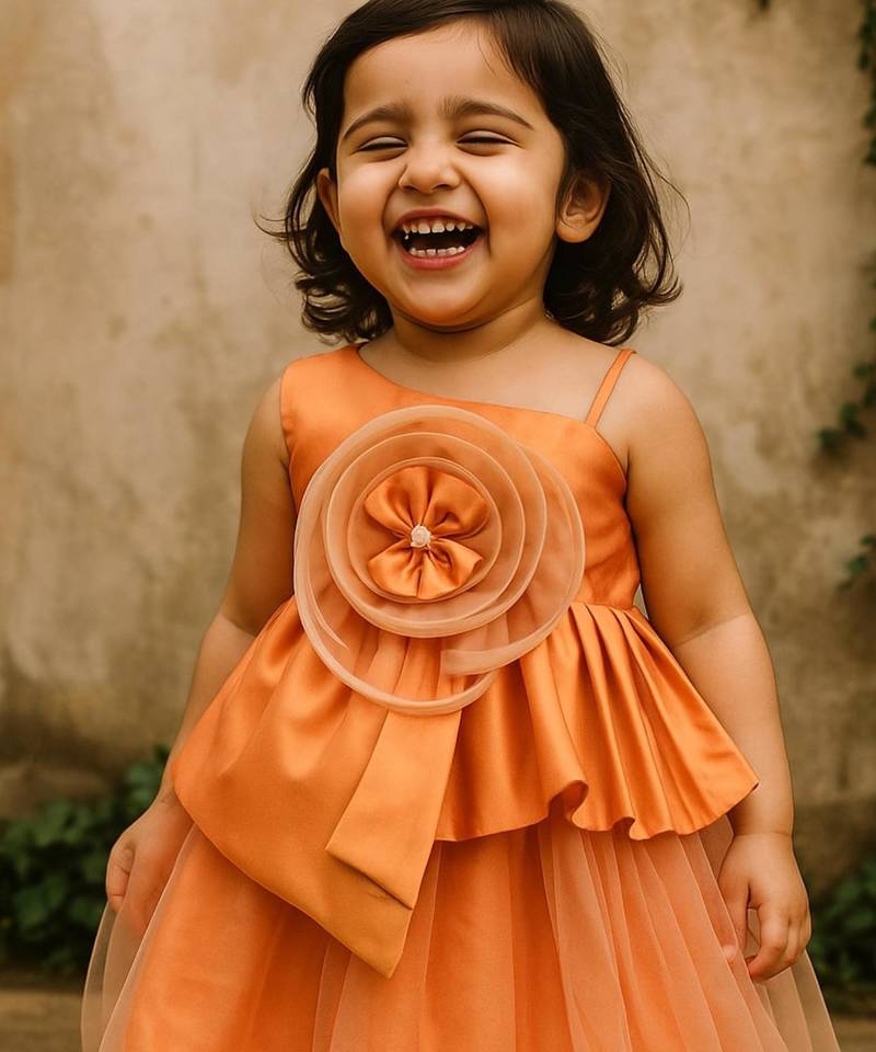 | Product Description | Dark Peach Coloured Designer Flower Birthday Dress Is The Latest Outfit For Baby Girls. Stylish Pleated Dress With 3 Flower Are The Highlight. The Flare Comes With A Layer Of White Net Adding More Punch To It. Made With Satin And Net, This Is An Exquisite Dress For Birthday Parties And Special Occasion. Buy Online To Dress Your Girl Like A Princess. |