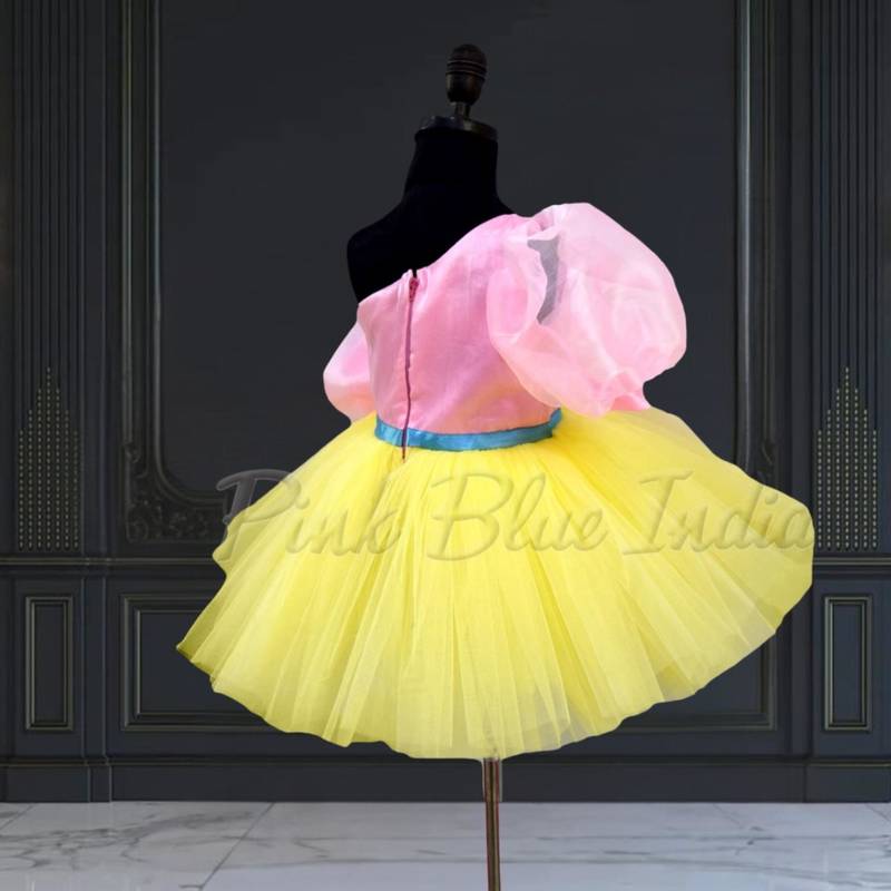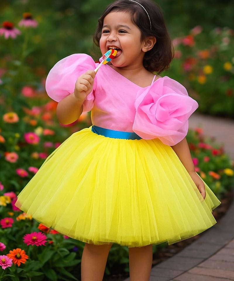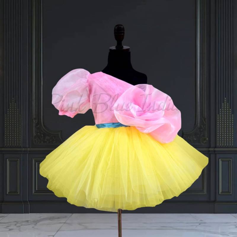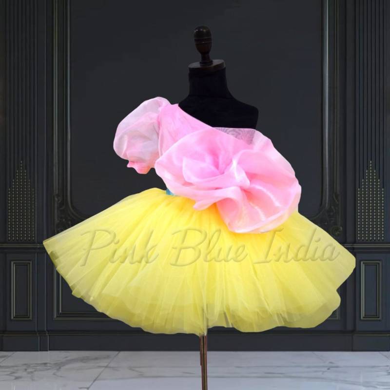 | Product Description | Latest And Cute One Shoulder Knee Length Frock For Birthday Girl In Beautiful Combinations Of Lemon Yellow And Baby Pink With A Dash Of Blue. The Waist Is Enhanced With A Big Flower. |