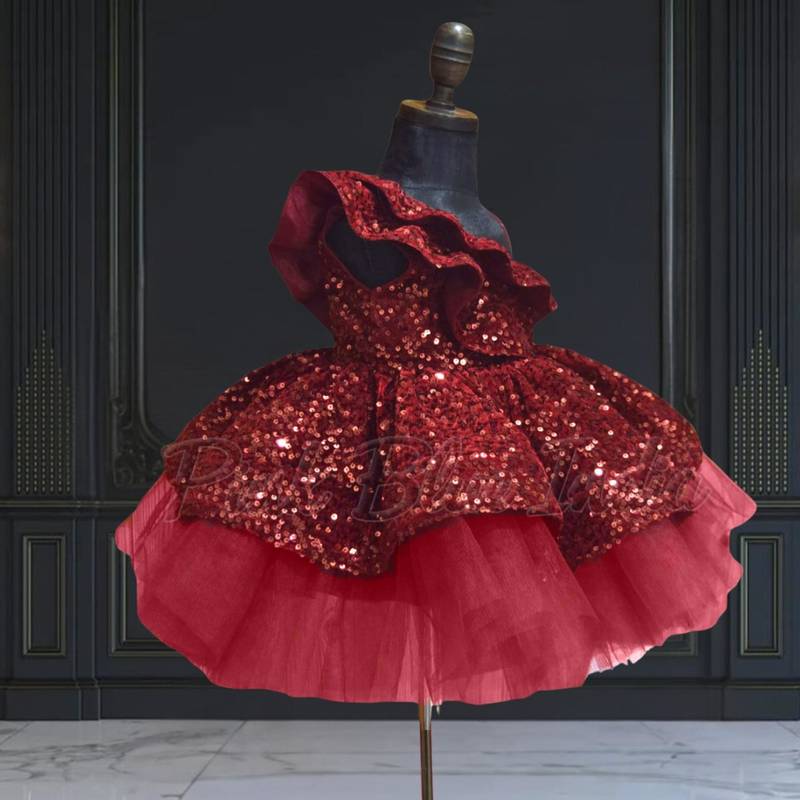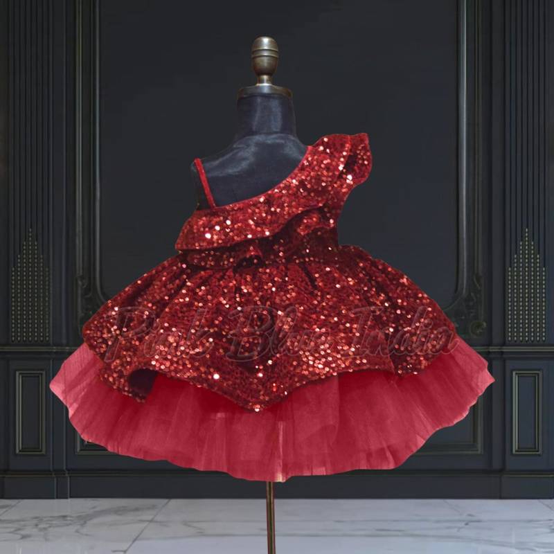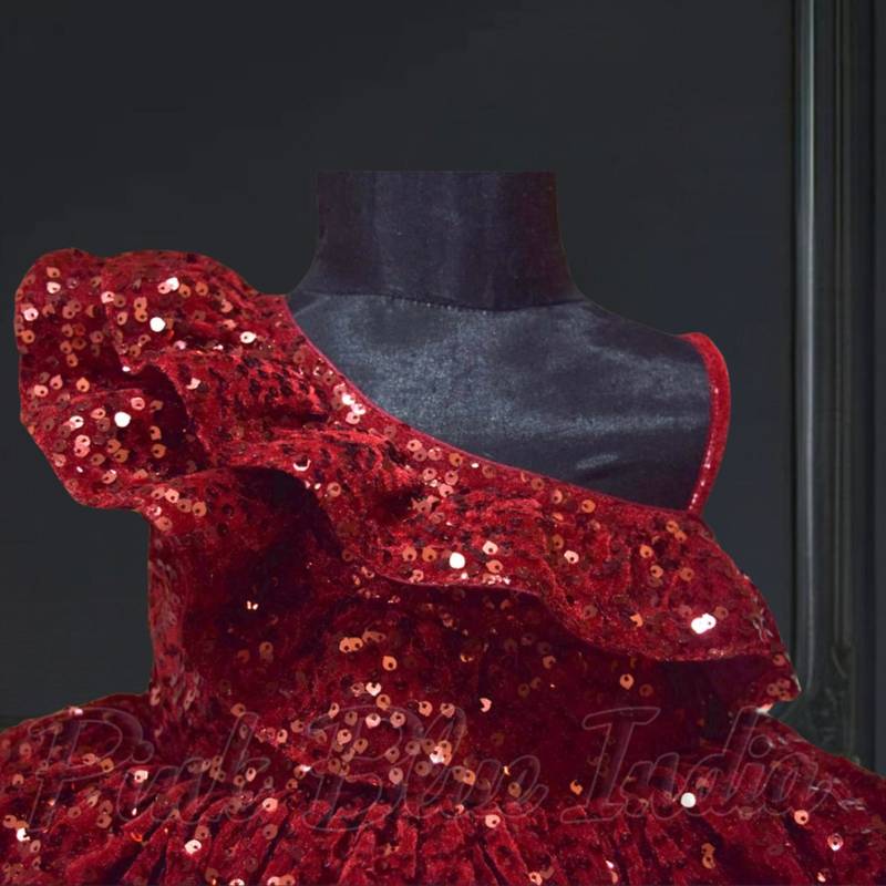 | Product Description | Have Her Shine Like A Star At Every Birthday And Wedding This Season With One Shoulder Ruffled Frock. This Velvet Sequins Frock In Maroon Color Makes A Resplendent Party Wear Frock For Baby Girls In India. Designed For Girls Of Age 6 Months To 12 Years, It Makes A Fashionable Designer Frock To Buy At Pink Blue India For Special Occasions. | |