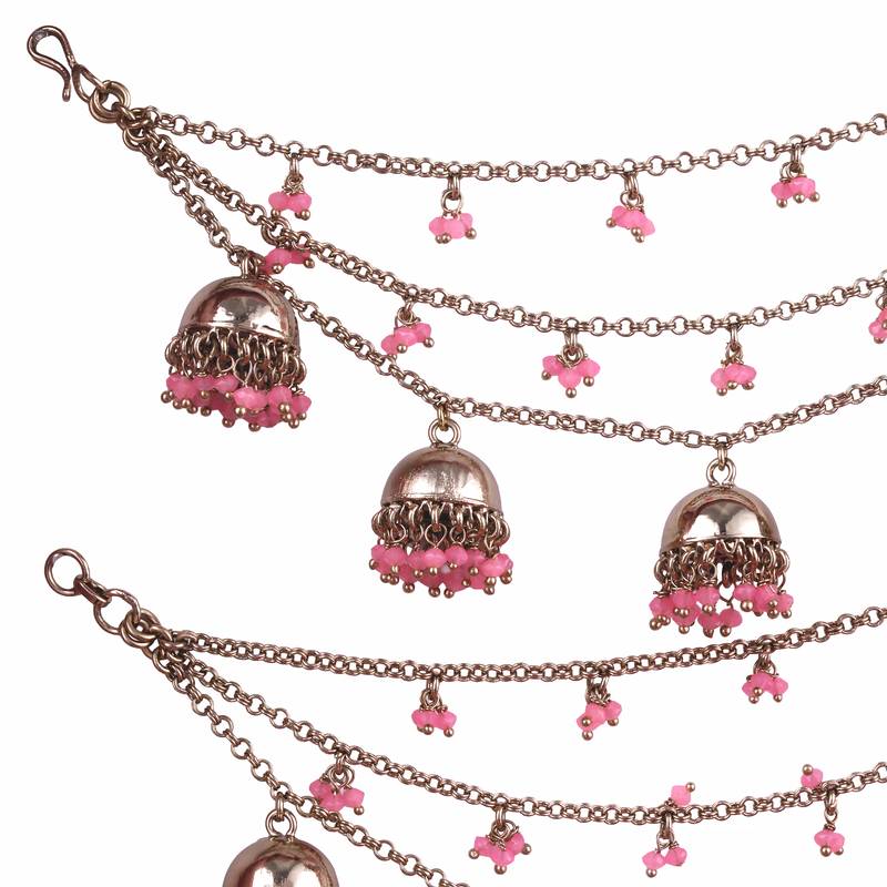 Latkan jhumki pink pearl 3 string antique gold plated set of 2 brass ear-chain (kaanchain) for women