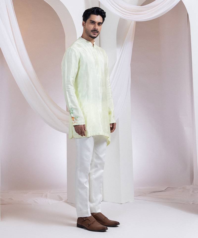 | Product Description | The Light Pistachio Green Kurta Set Features Delicate Scattered Thread Beads Work All Over ,For Minimal Look.The Understated Elegance Is Elevated By Subtle Bird And Foliage Hand Painting Highlighted With Golden Thread, Sequins And Beads Peeking From The Cuff, Offering A Touch Of Charm. Ideal For Daytime Festivities Or Intimate Celebrations.