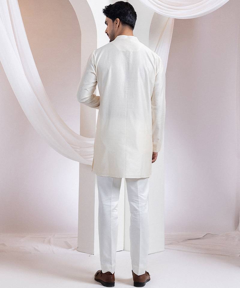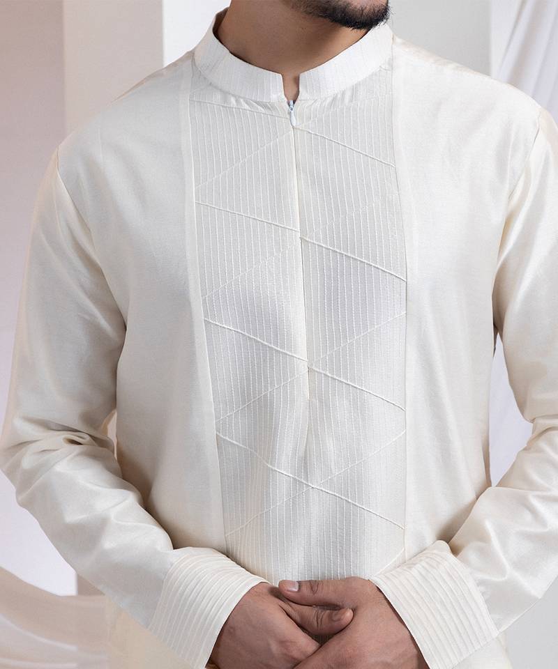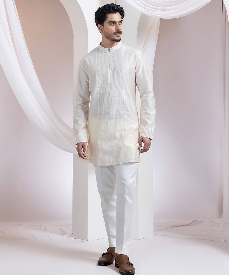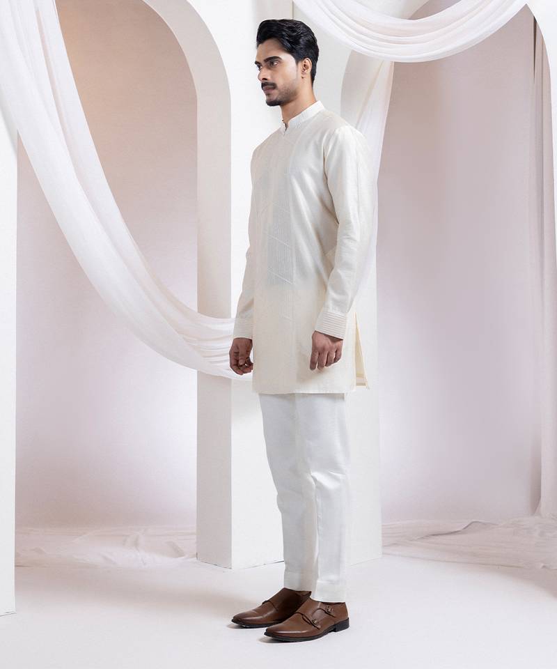 | Product Description | A Contemporary Two Piece Set Featuring A Straight Kurta And Pants, Designed With Modern Minimalism In Mind. The Kurta Showcases Tone On Tone Linear Thread Embroidery Forming A Sleek Geometric Pattern On The Front Panel, While The Sleeves Are Finished With Refined Horizontal Pintucks.
