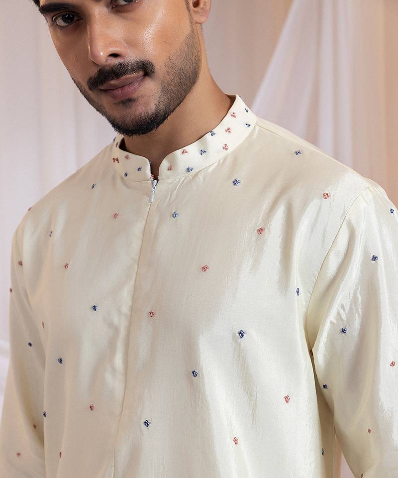 | Product Description | This 3 Piece Set Consists Of Kurta, Nehru And Pants. Kurta Having Blue And Pink French Knot Embroidery Spread Evenly Across The Surface Whereas Nehru Having Intricate Multicoloured Thread Embroidery In Floral And Foliage Motifs With Highlights Of Beads And Threads On Front Panel. Ideal For Wedding Wear Or Any Indian Festival