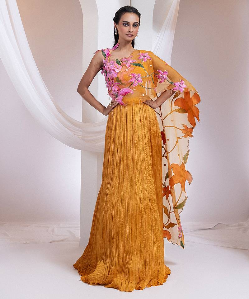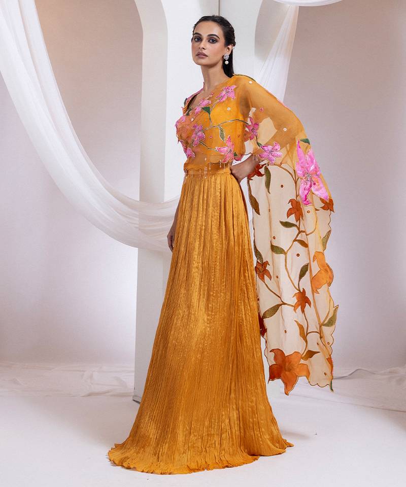 | Product Description | A Luminous Festive Ensemble In Rich Kesar Orange, This Three Piece Set Evokes The Glow Of Early Light Through Forest Foliage. The Ruched Lehenga Skirt Is Paired With A Blouse Adorned In Hand Painted Floral Appliqué, Accented With Sequins And Delicate Beadwork. A Detachable Sheer Organza Dupatta, Also Hand Painted And Appliquéd, Adds A Light, Layered Elegance.