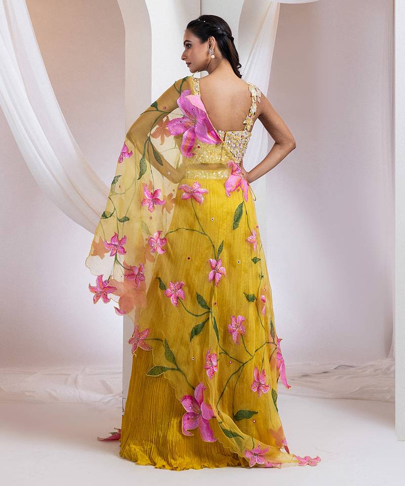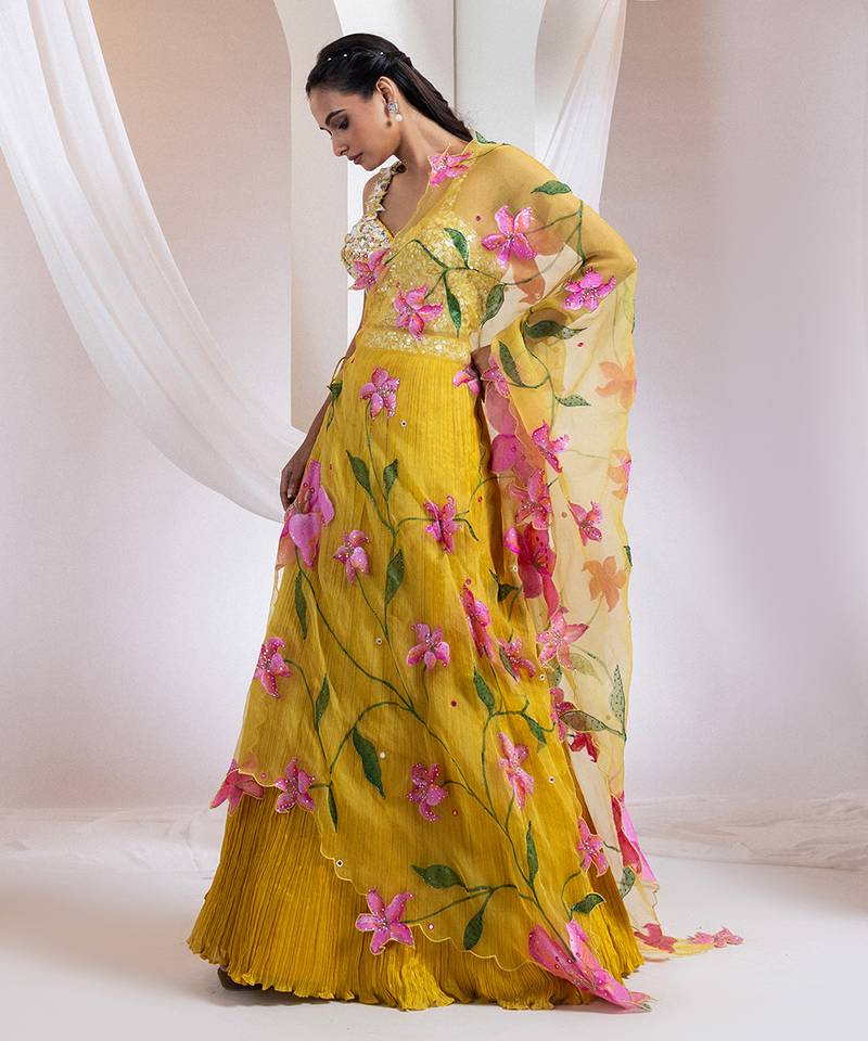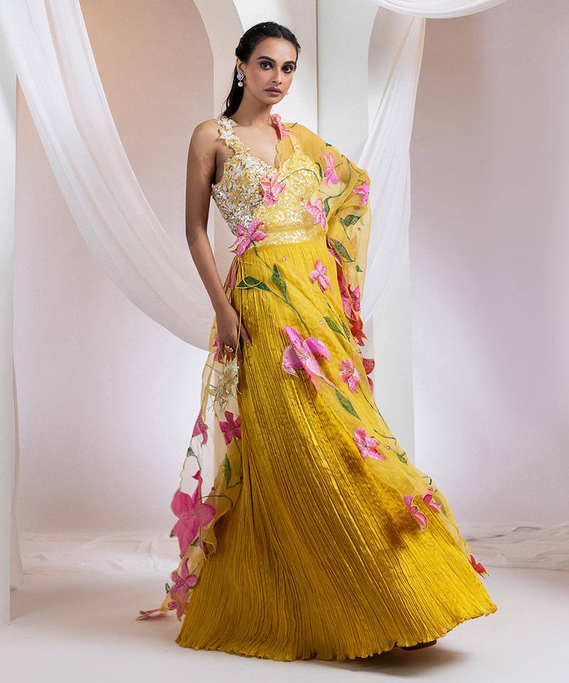 | Product Description | A Radiant Three Piece Lehenga Set In Deep Mustard Yellow, Perfect For Sunlit Celebrations. The Fitted Bodice Is Richly Embellished With Sequins, Mirror Work, And 3 D Thread Appliqué Florals, Paired With A Softly Ruched Skirt. Draped Over Is A One Sided, Hand Painted Organza Overlay With A Cutwork Edge—Adorned With Scattered Mirrors, Sequins, And Delicate Bead Detailing.
