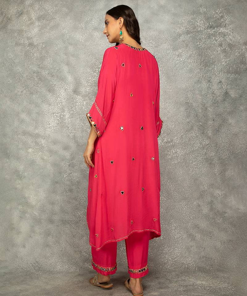 | Product Description | Featuring Fuchsia Crepe Hight Low Kaftan With Mirror Work Scattered Across The Body, Neckline. It Is Paired With Matching Crepe Pants Featuring Mirror Detailing On The Edges.