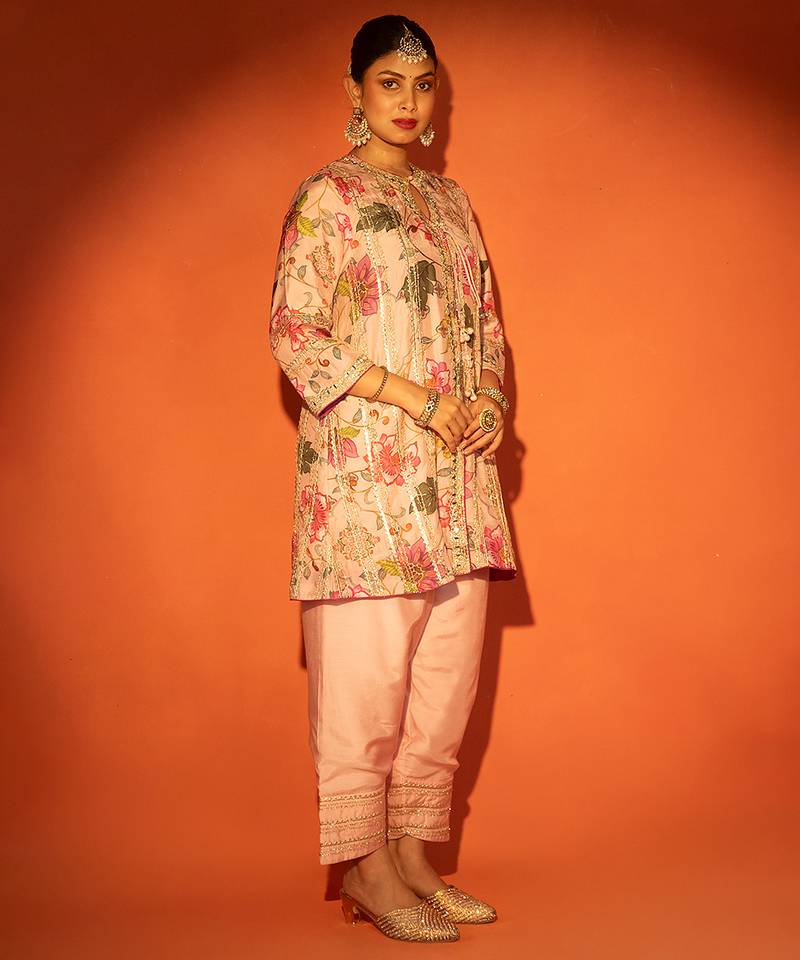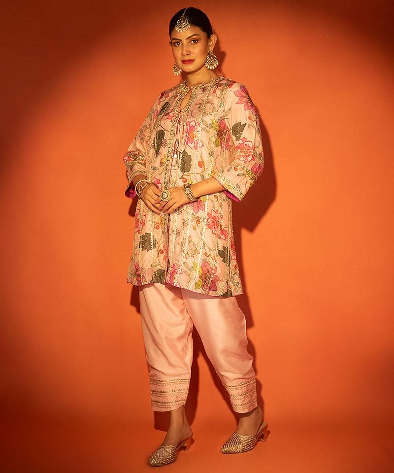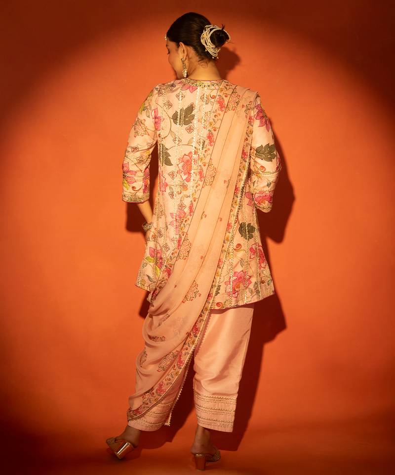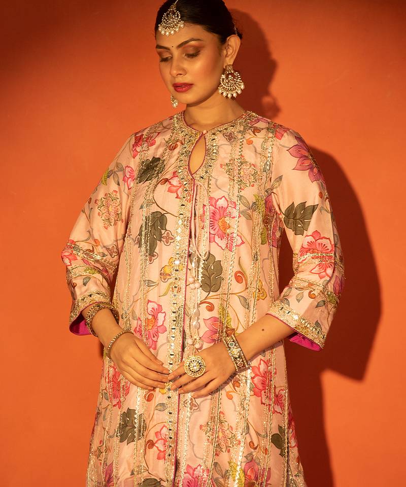 | Product Description | Featuring A Pink Floral Printed Embroidered Cotton Silk Angrakha, Paired With Matching Cotton Silk Pants And A Delicate Organza Dupatta For An Elegant Finish.