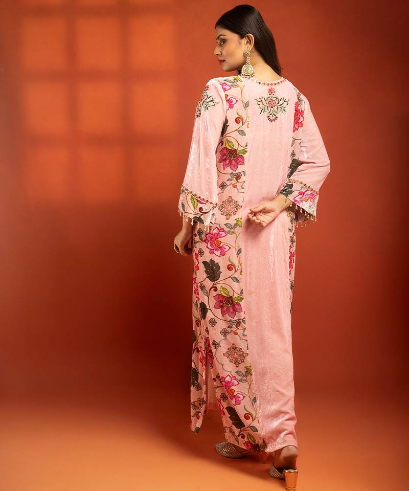 | Product Description | Featuring A Pink Printed Side Panel Long Kurta With Front Embroidery, Paired With A Lycra Churidar.