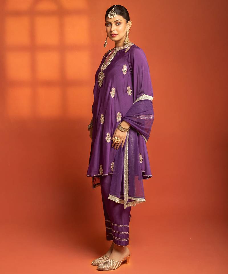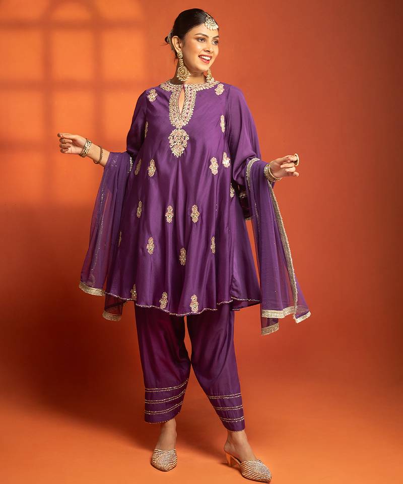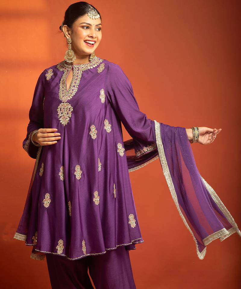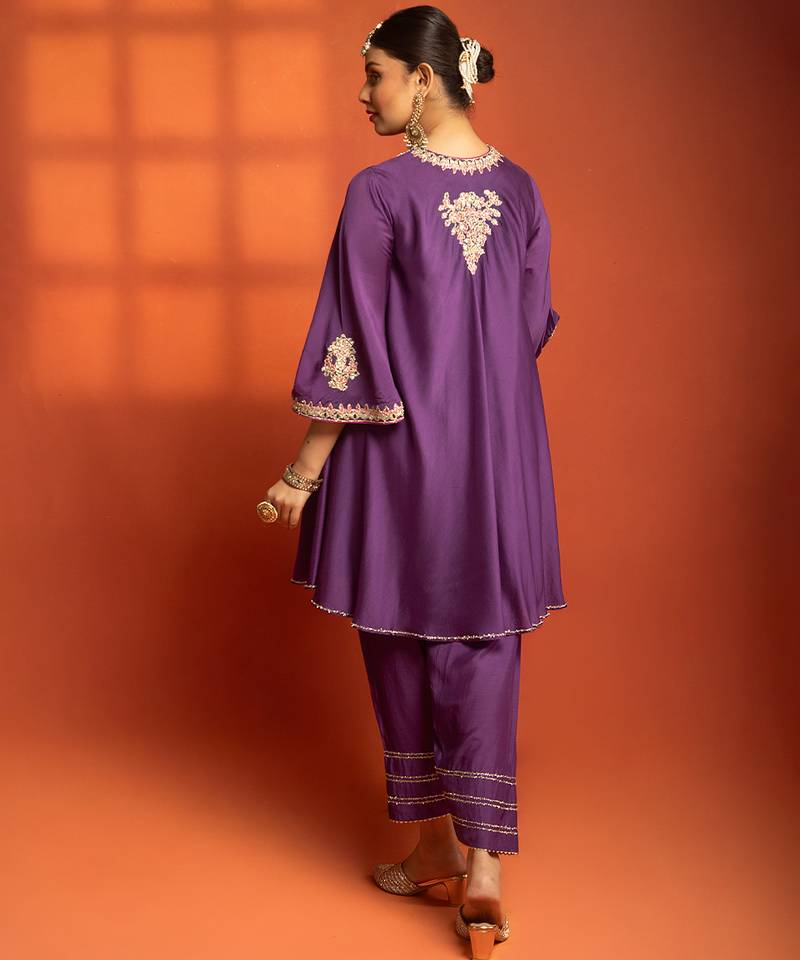 | Product Description | Featuring A Purple Short Flared Cotton Silk Kurta With Delicate Embroidery, Paired With Matching Cotton Silk Salwar Pants And A Sheer Net Dupatta.
