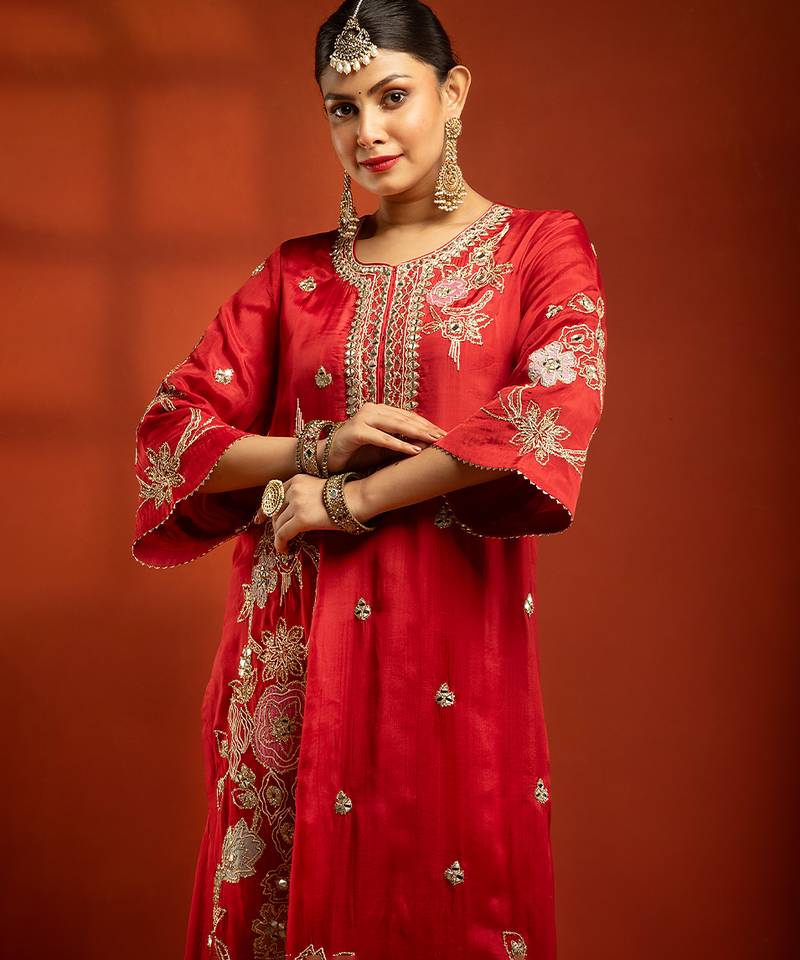 Featuring A Red Cotton Silk Embroidered Kurta Paired With Matching Cotton Silk Pants And A Sheer Net Dupatta.