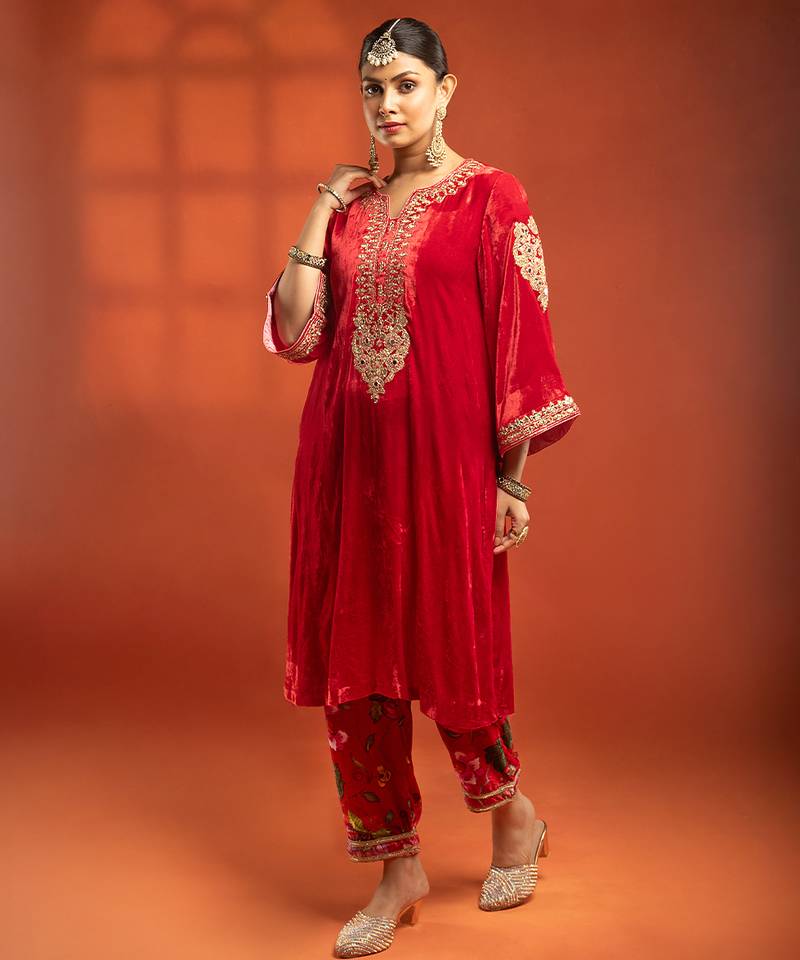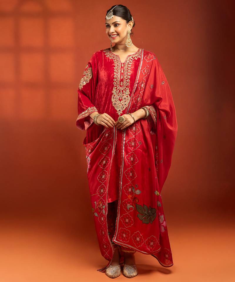 | Product Description | Red Silk Velvet Kurta Paired With Printed Silk Velvet Salwar Pants And A Tabby Silk Dupatta.