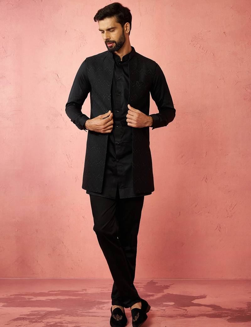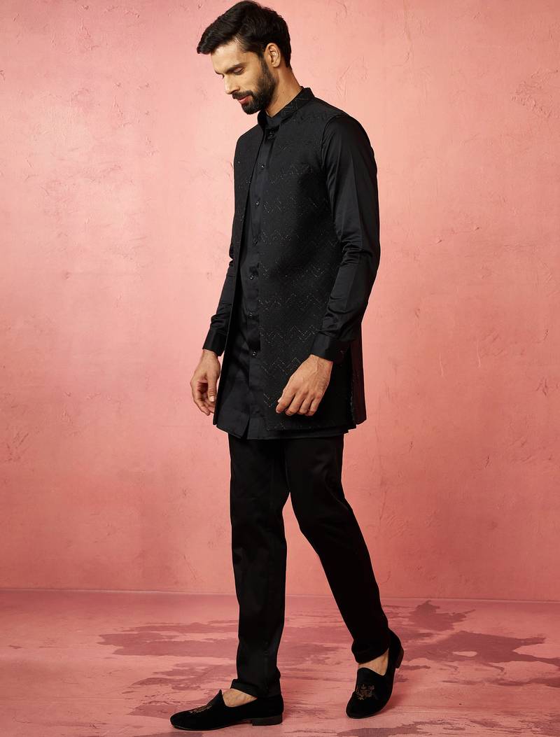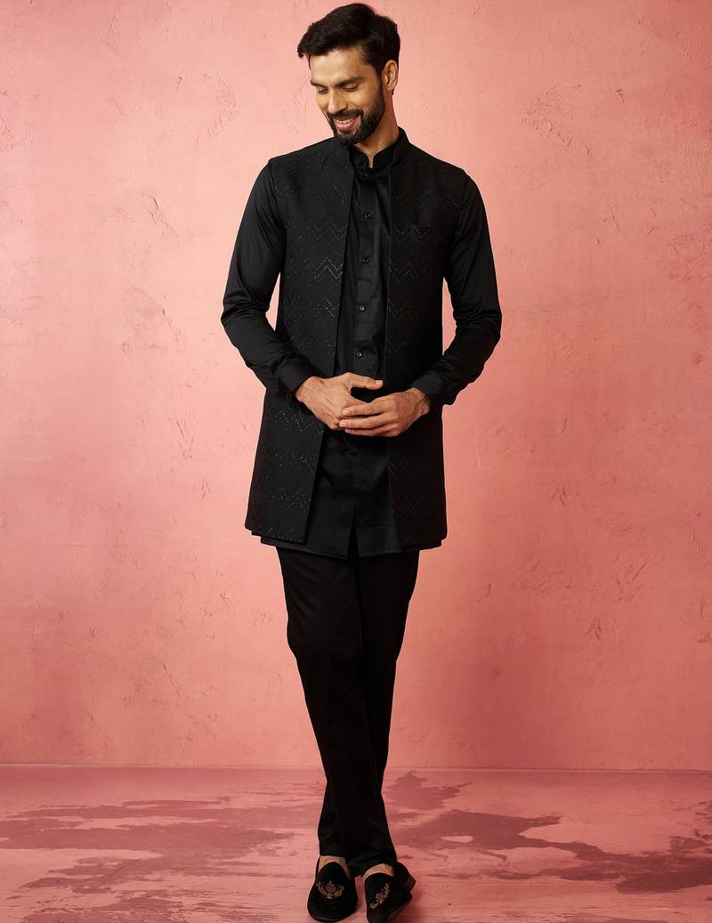| Product Name | Black Jacquard Nehru Jacket With Satin Kurta 3 Piece Wedding Set | |