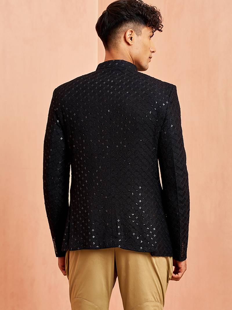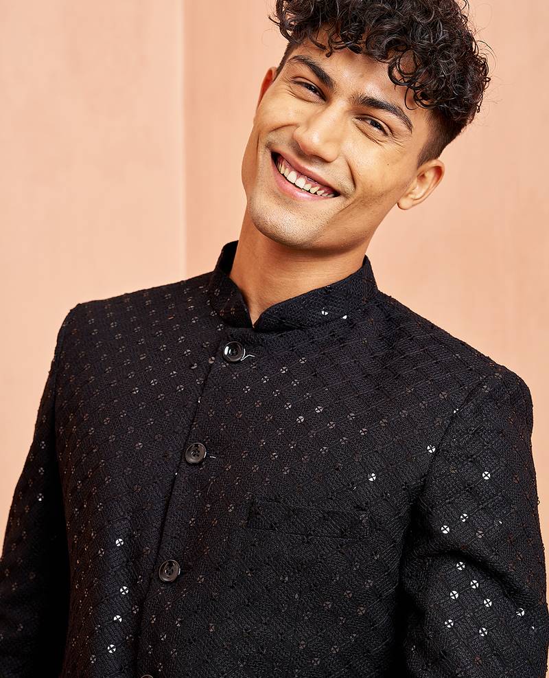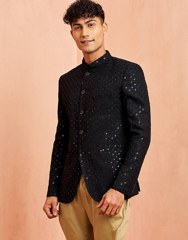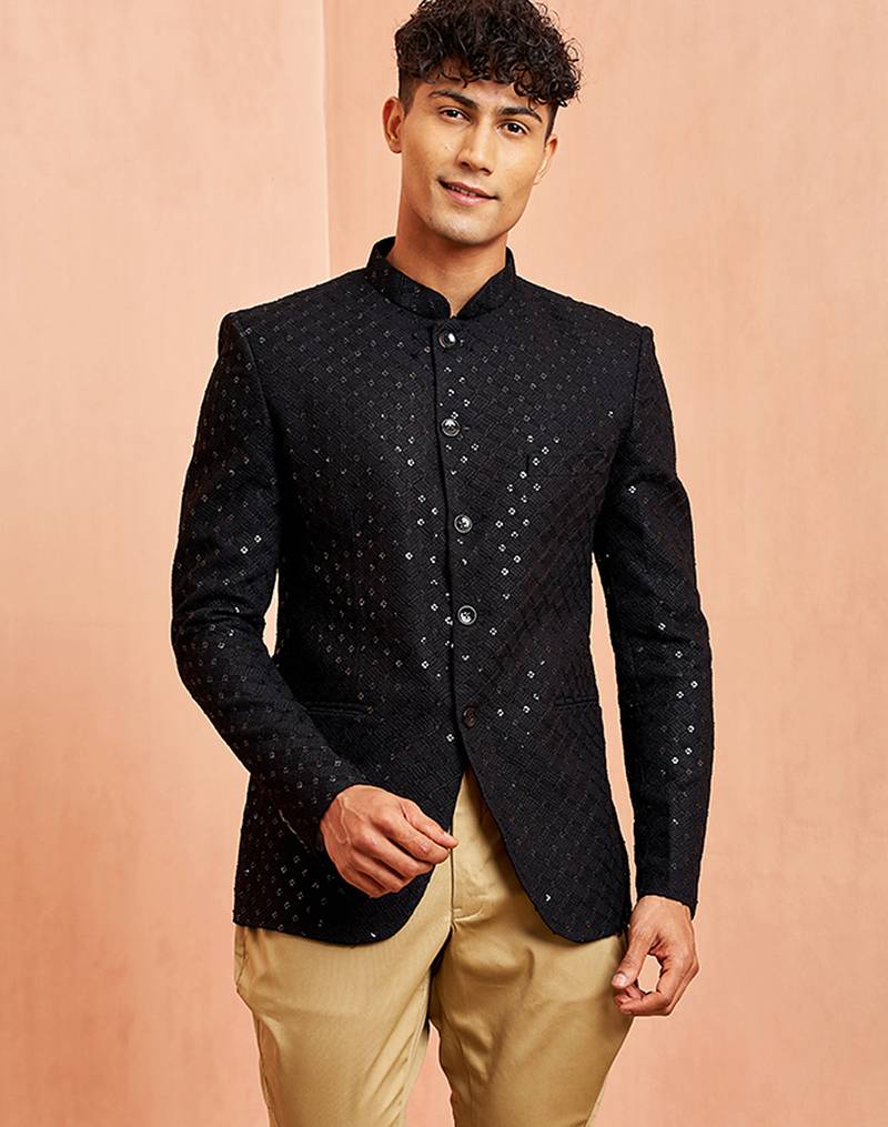 | Product Description | Make A Royal Statement With Vastramay's Black Jodhpuri Set. Features Geometric Sequin Embroidery On Premium Cotton Blend Fabric With Satin Lining, Paired With Chiku Satin Breeches For The Perfect Wedding Look. | |