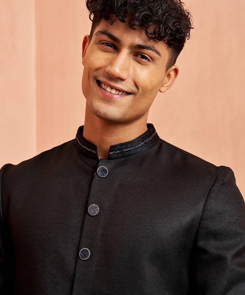 | Product Description | Step Into Elegance With Vastramay's Premium Black Indo Western Kurta Pant Set, Meticulously Designed For The Modern Gentleman Who Appreciates Traditional Craftsmanship. This Sophisticated Ensemble Features A Knee Length Jute Kurta With Intricate Geometric Sequin Embroidery Adorning The Mandarin Collar, Paired With Comfortable Cotton Lycra Pants For The Perfect Fit. The Kurta Showcases Full Sleeves With A Straight Silhouette, Button Closure, And Luxurious Crepe Lining For Enhanced Comfort. Ideal For Weddings, Diwali, Eid, Navratri, And Festive Occasions, This Versatile Set Effortlessly Transitions From Traditional Ceremonies To Contemporary Celebrations. The Premium Jute Fabric Offers Durability And Breathability, While The Cotton Lycra Pants Ensure Comfort Throughout Extended Wear. Available In Sizes 36 42, This Timeless Piece Combines Cultural Heritage With Modern Styling. | |