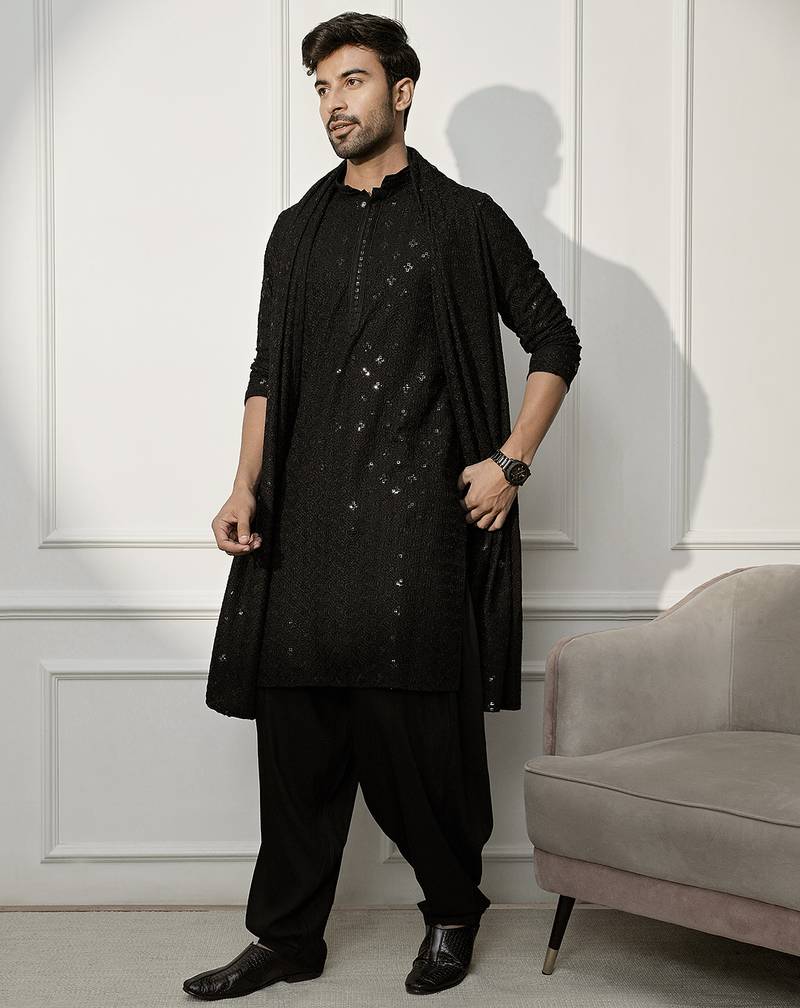 | Product Description | This Vastramay 3 Piece Festive Set For Men Includes A Black Chikankari Embroidered Kurta, A Patiala Style Viscose Bottom, And A Matching Rayon Dupatta. A Timeless Blend Of Comfort And Traditional Elegance For Any Celebration. | |