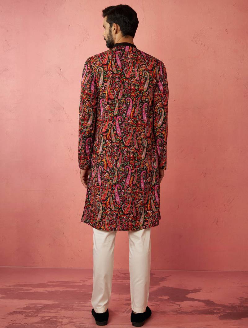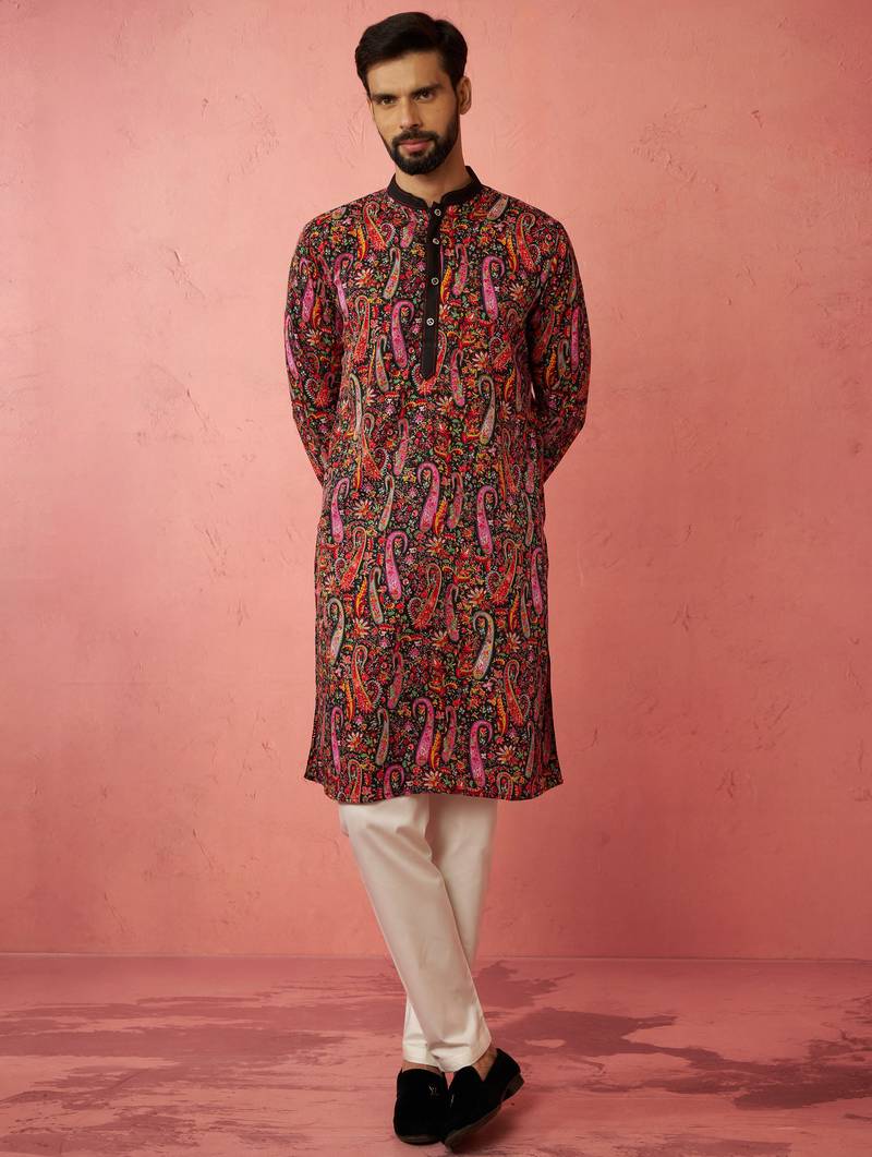 | Product Description | Add Elegance To Your Ethnic Wardrobe With Vastramay's Black Long Kurta. Features Beautiful Digital Print With Traditional Paisley Motifs On Premium Viscose Blend, Paired With Comfortable Cream Fine Satin Pyjama. | |