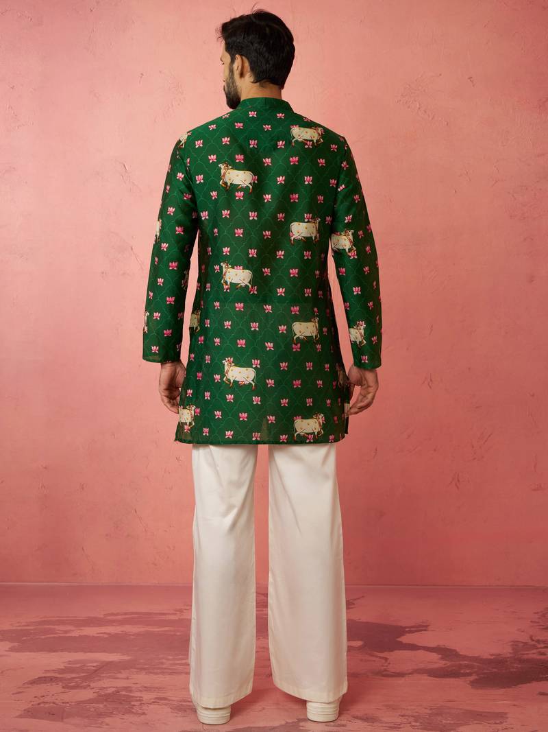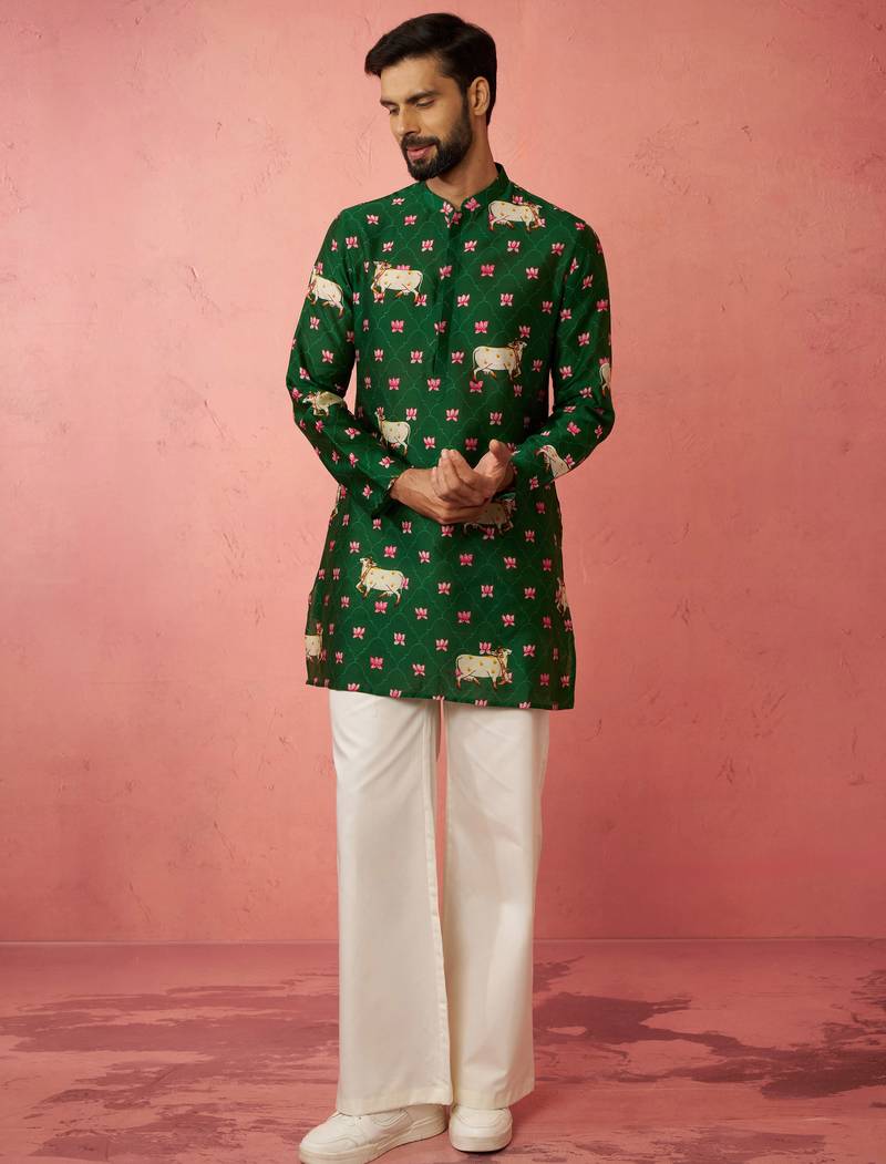 | Product Description | Make A Statement With Vastramay's Green Digital Printed Kurta Set Featuring Unique Animal And Floral Motifs. Paired With Luxurious Cream Fine Satin Palazzo Pant For The Ultimate Festive And Wedding Ensemble. | |