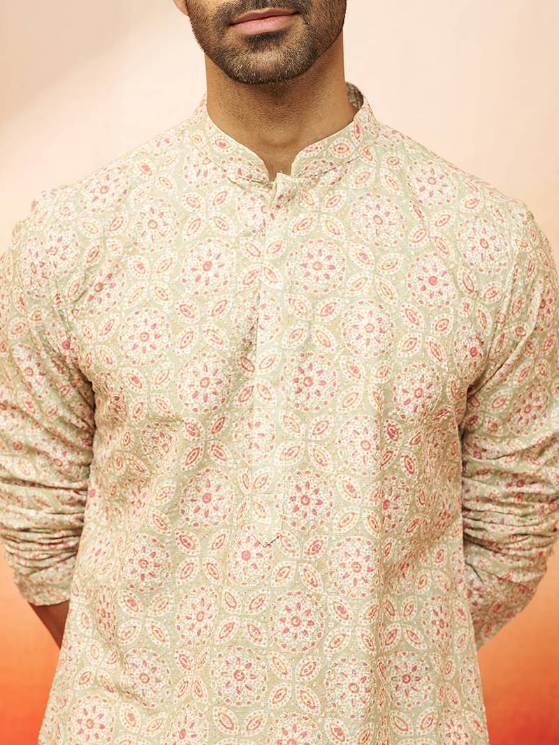 | Product Description | Elevate Your Festive Wardrobe With Vastramay's Green Embroidered Kurta Set. Features Beautiful Embroidery Work With Mandarin Collar Design On Premium Cotton Blend Fabric, Paired With Comfortable Cream Cotton Lycra Trousers For Traditional Celebrations. | |