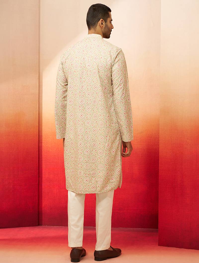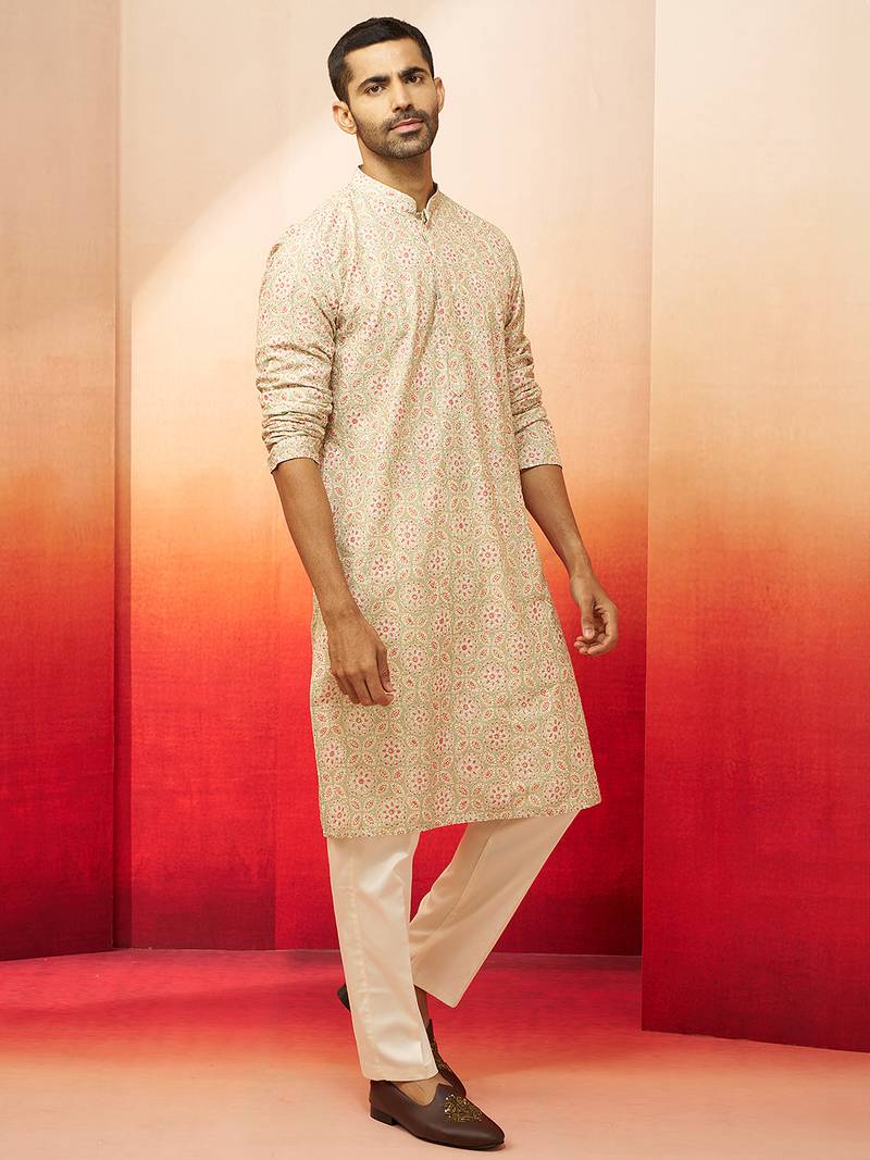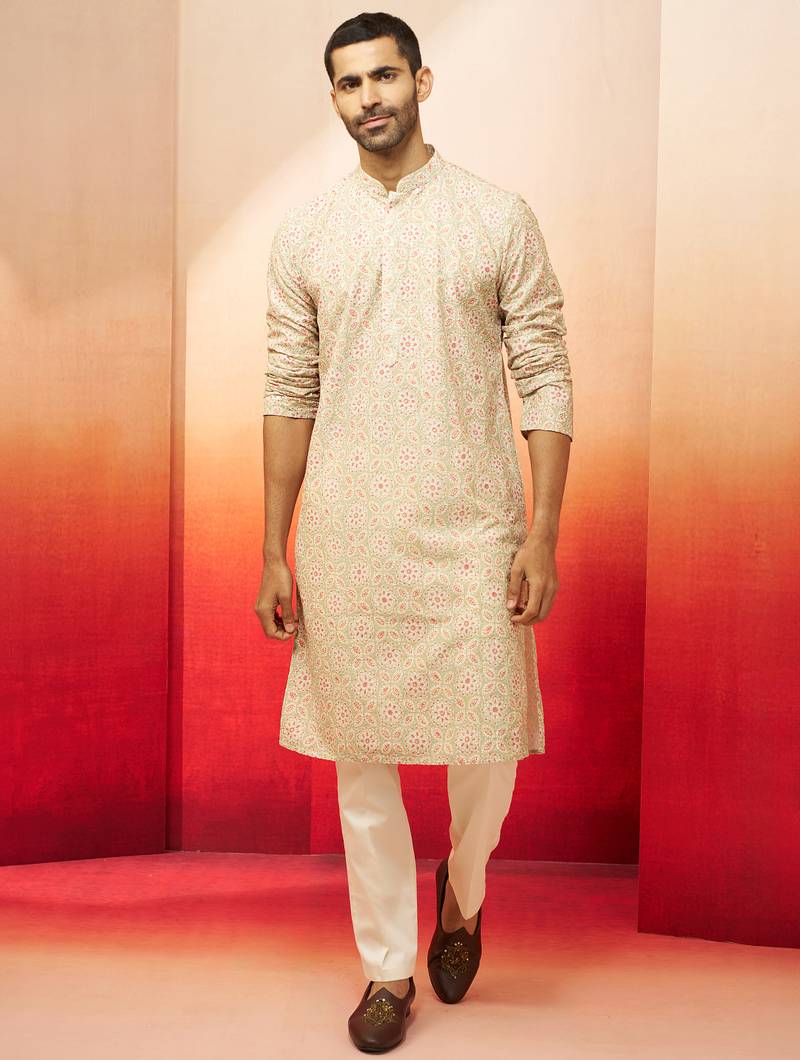 Beige embroidered kurta with cream pants - ethnic set