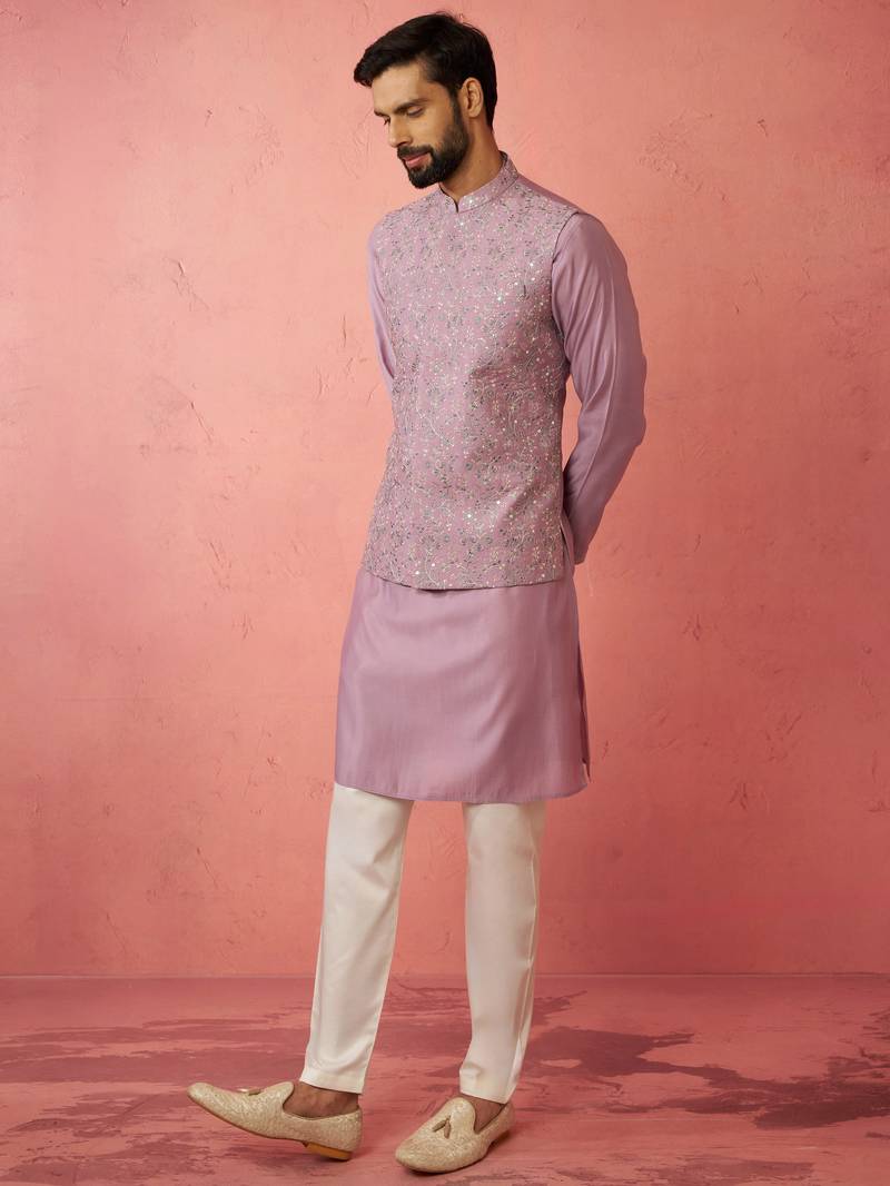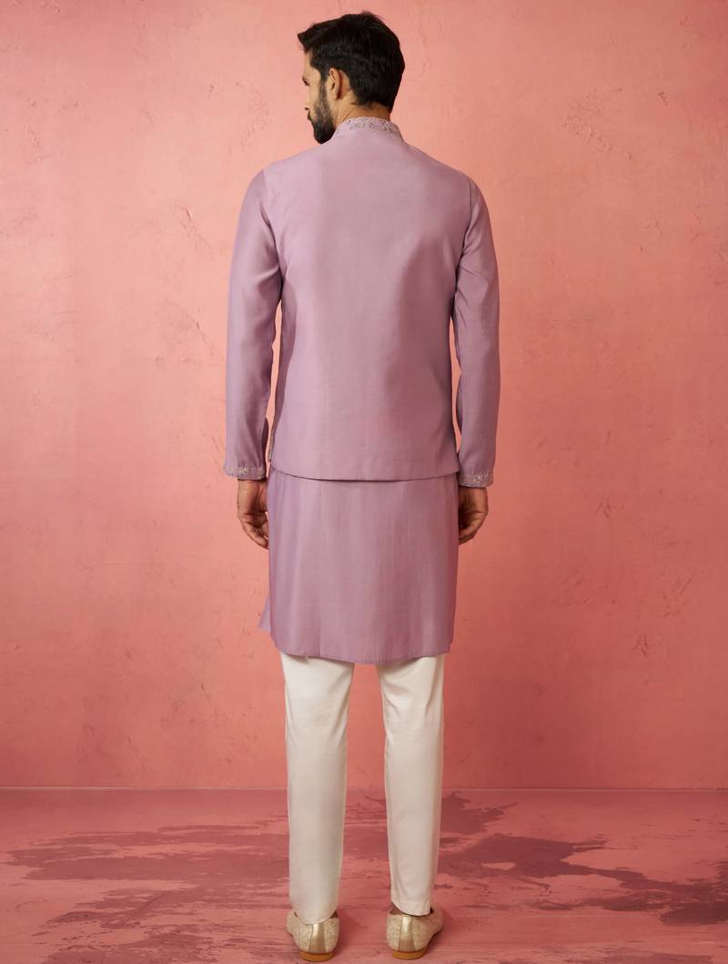 | Product Description | Add Elegance To Your Ethnic Wardrobe With Vastramay's Lavender Nehru Jacket Set. Features Beautiful Thread Embroidery With Traditional Floral Motifs On Premium Silk Blend, Paired With Comfortable Cream Fine Satin Pyjama. | |