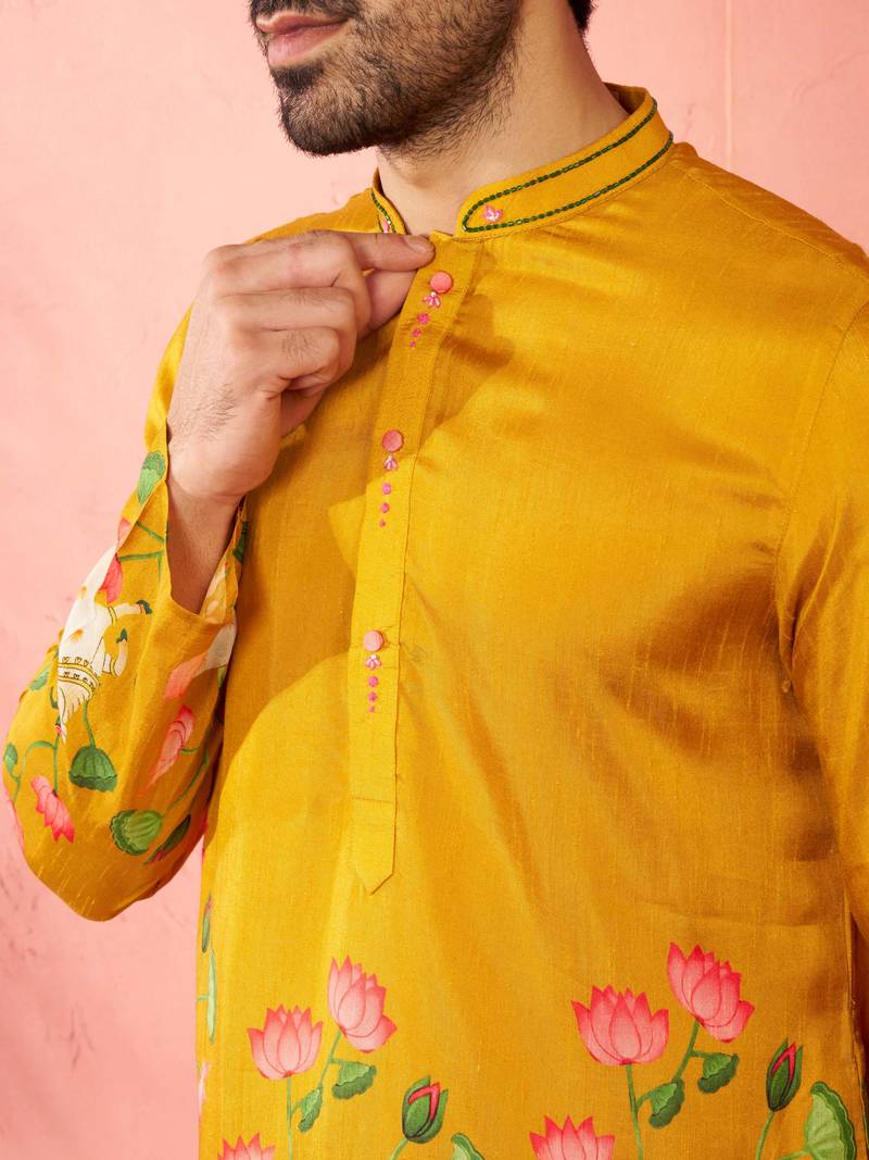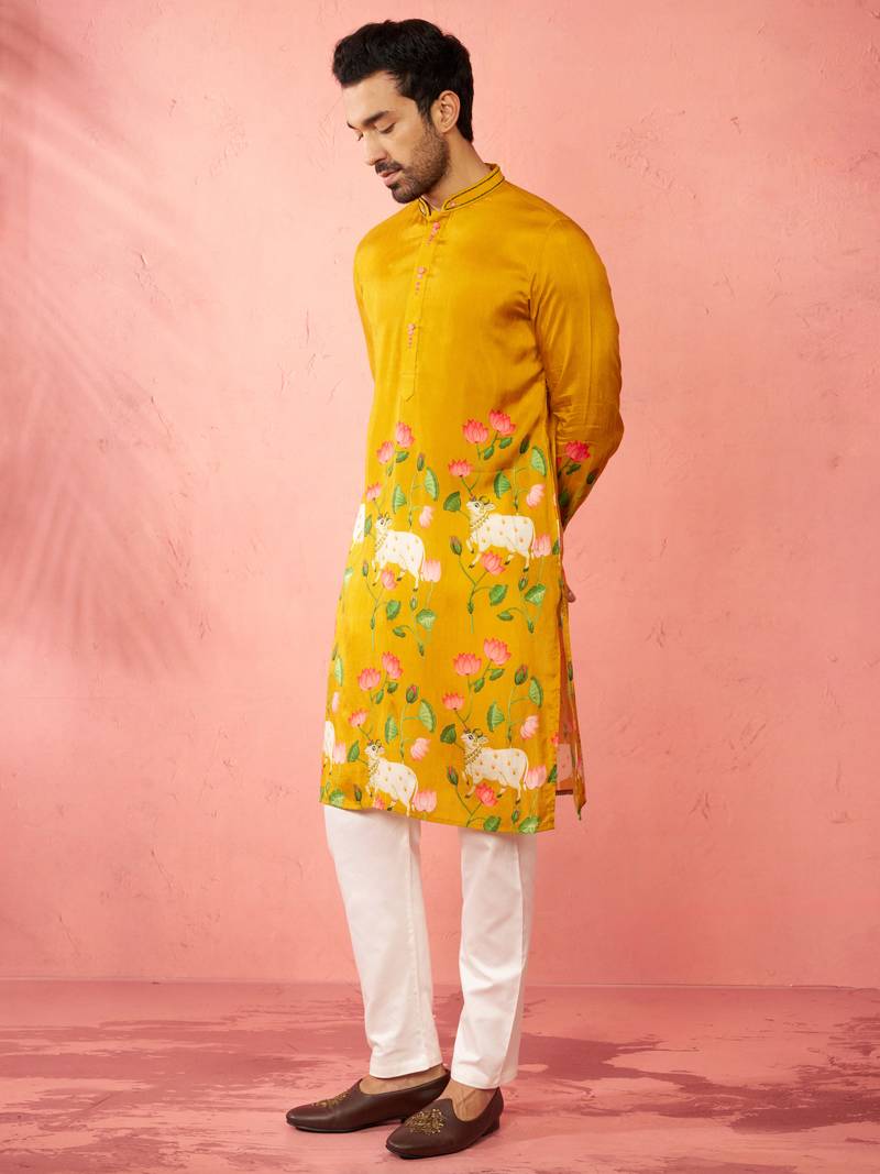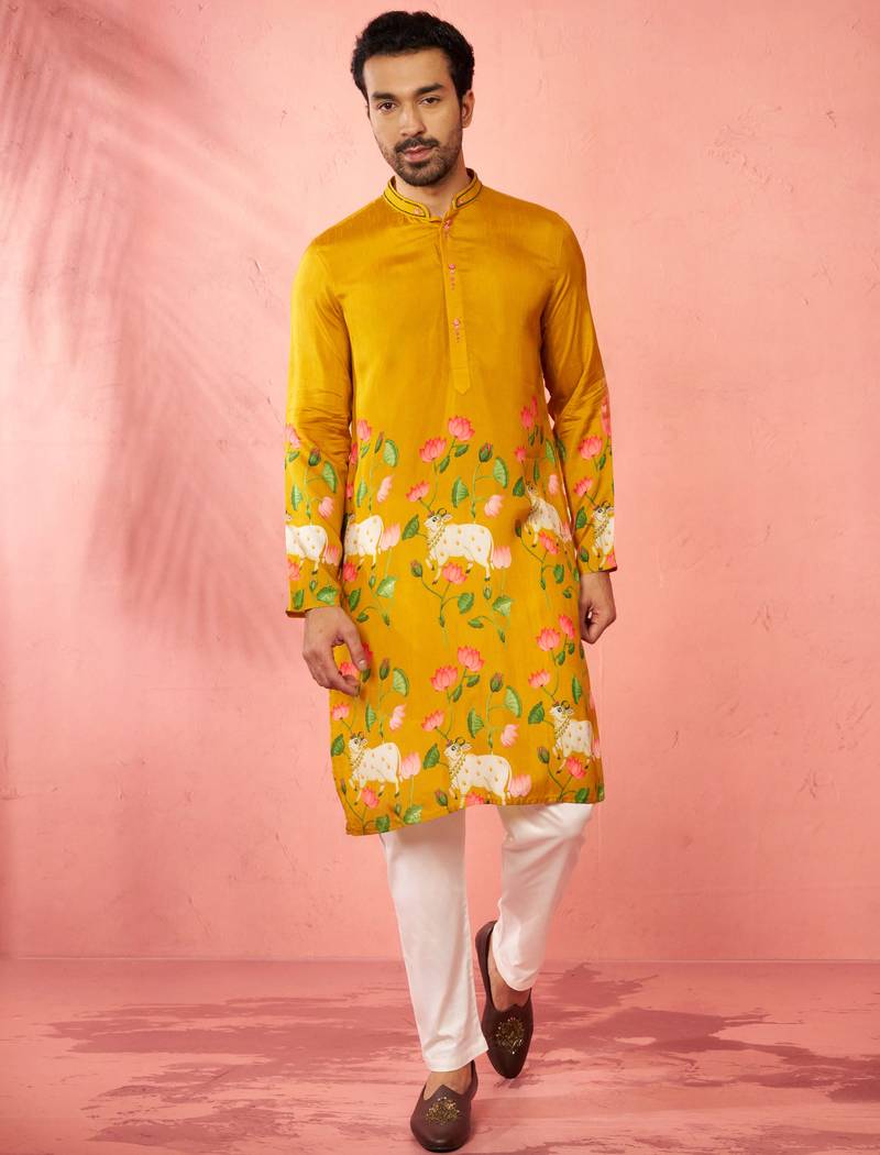 | Product Name | Mustard Dola Silk Digital Print Kurta With Cream Pyjama Festive Set | |