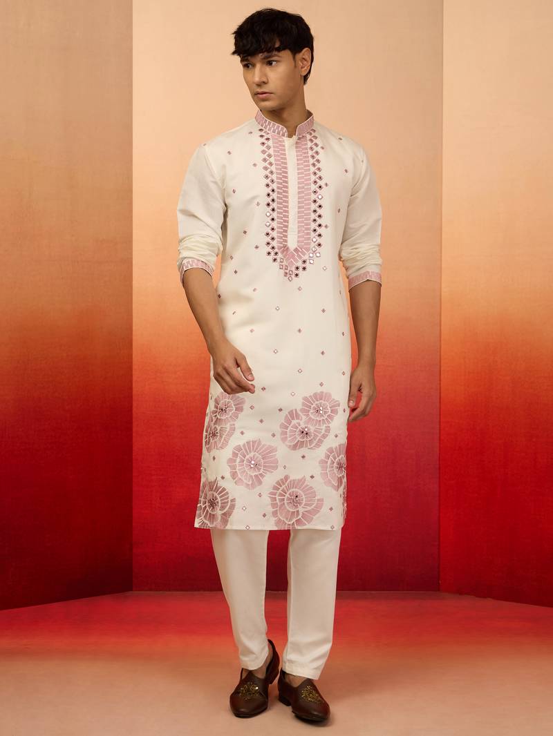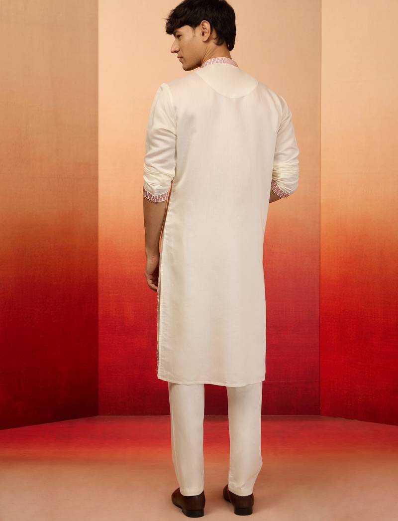Cream silk blend embroidered kurta with cream pyjama - diwali special set