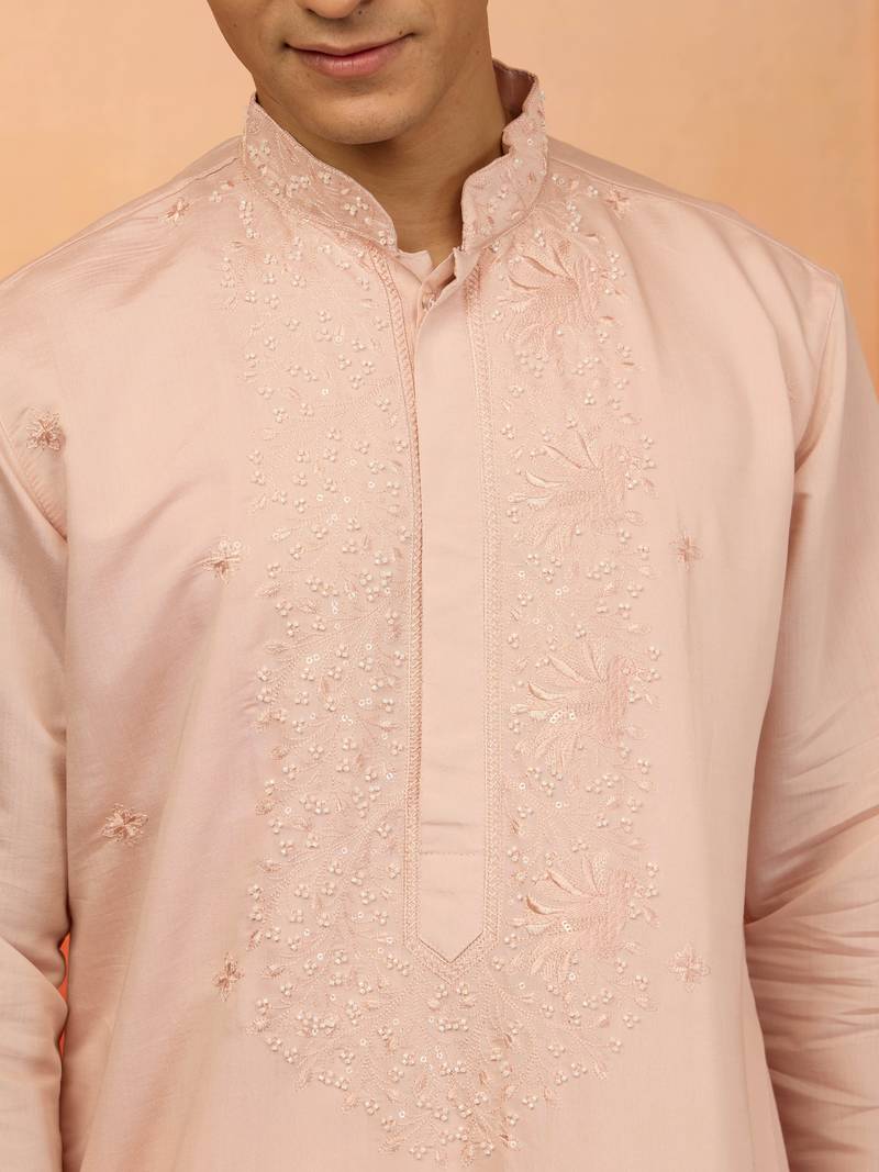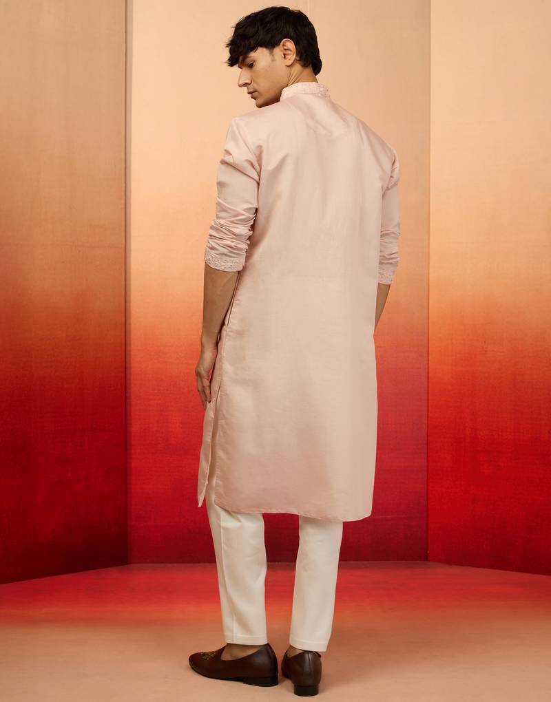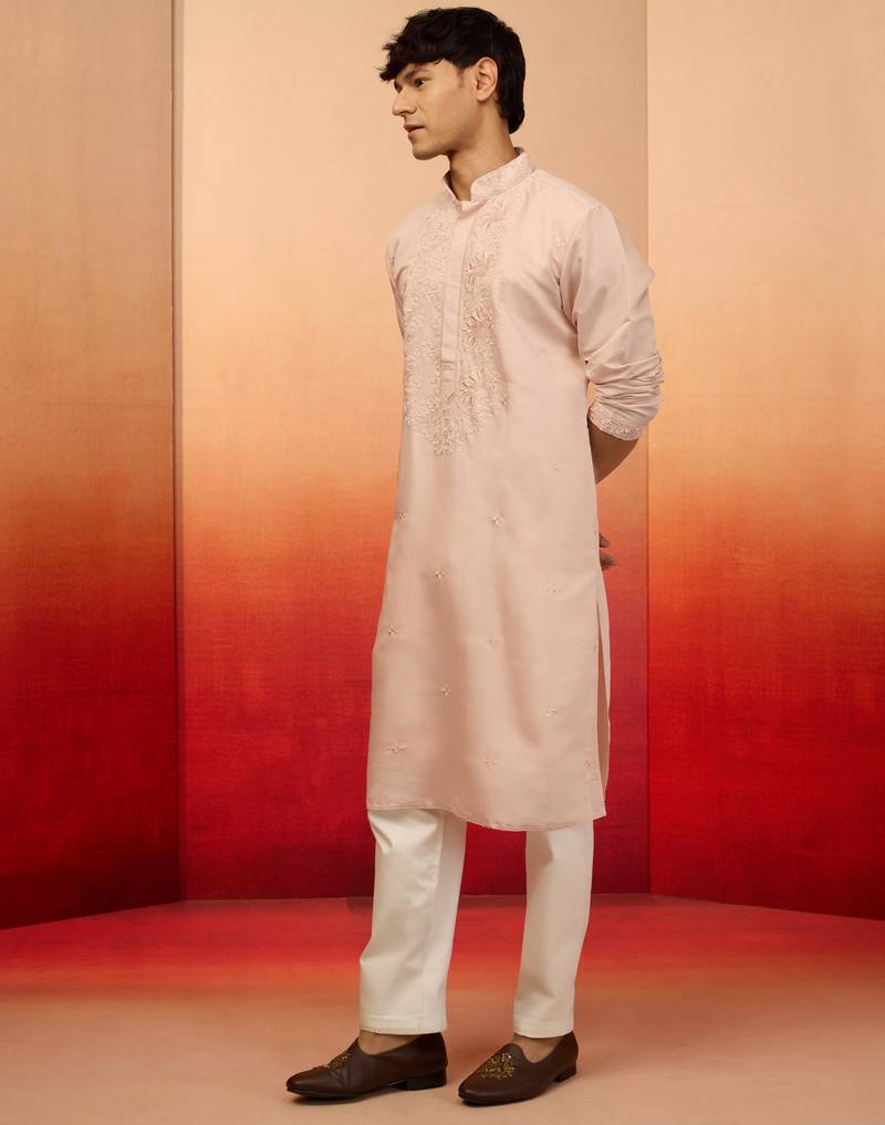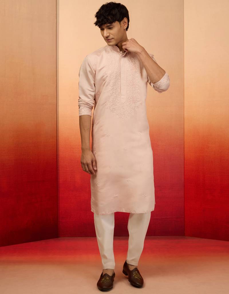 | Product Name | Peach Silk Blend Embroidered Kurta With Cream Pyjama Festive Set | |