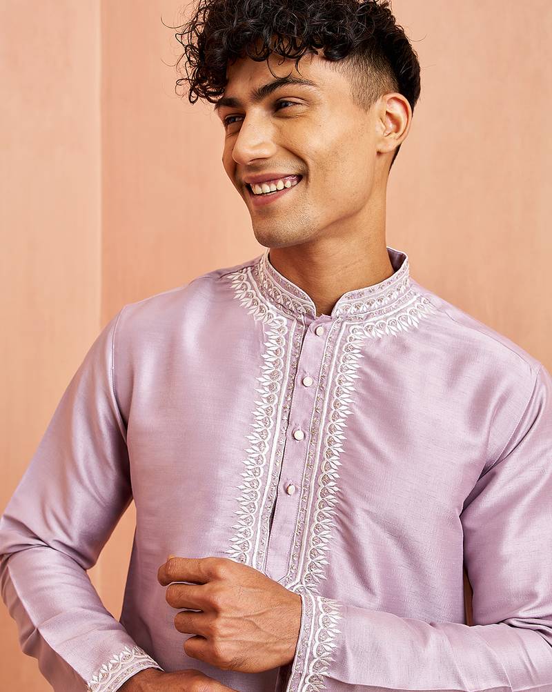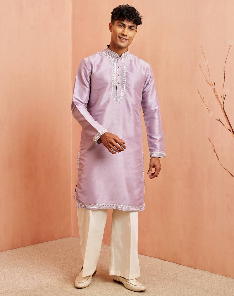 Purple silk kurta pyjama set - hand embroidery ethnic motif traditional festival wear