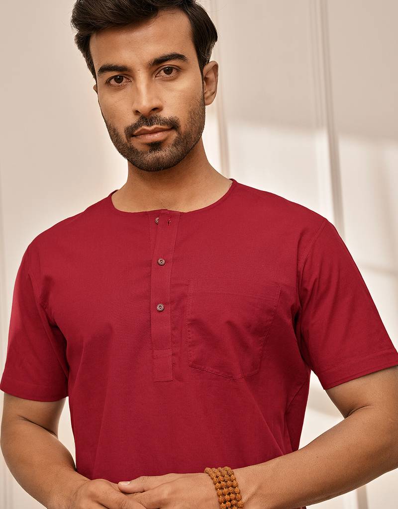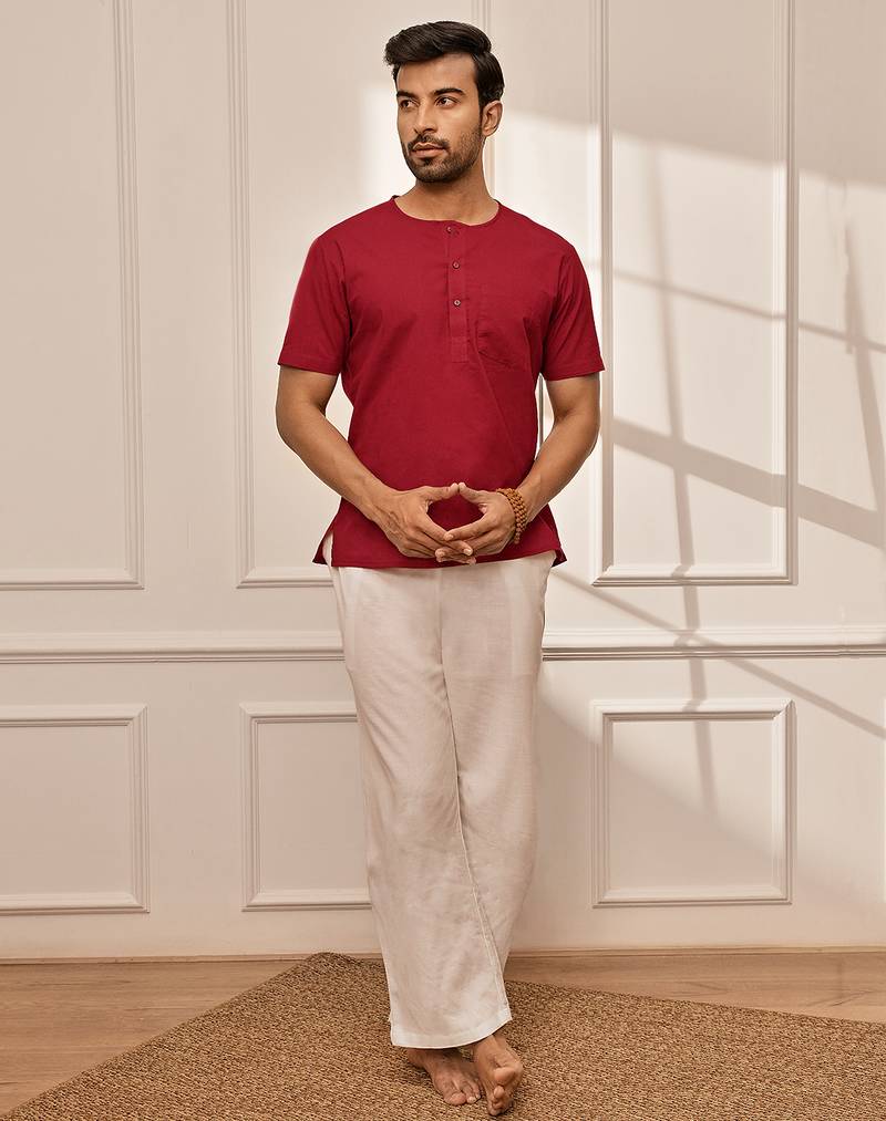 | Product Description | Embrace Inner Peace With Vastramay's Spiritually Inspired Mens Yoga Set Featuring A Vibrant Red Kurta With Meaningful Om And Ethnic Motif Embroidery. Thoughtfully Crafted In Premium Cambric Cotton, The Kurta Includes A Practical Patch Pocket, Comfortable Round Neck, And Secure Button Closure. Paired With Relaxed White Palazzo Pants Featuring Full Elasticated Waist And Convenient Side Pockets, This Set Offers Perfect Balance Of Comfort And Mindful Style For Yoga Practice, Meditation, Casual Wear, Or Spiritual Gatherings. | |
